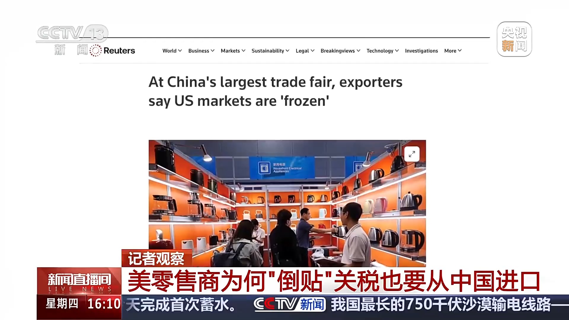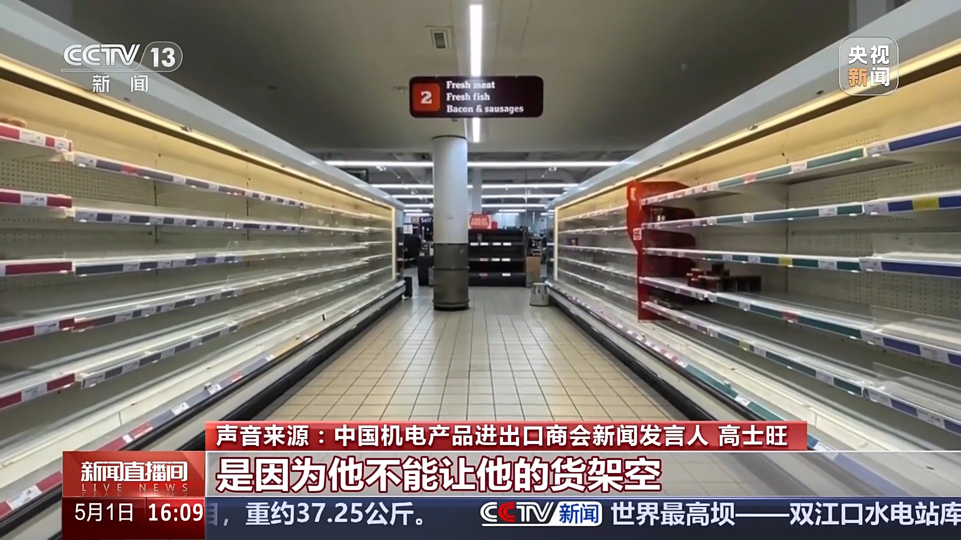 中国机电产品进出口商会新闻发言人 高士旺:我们不同的行业加起来走访的,包括我们也做了一些问卷,上千家企业总会有的。现在有些企业反映就是,美国的一些商超,要求我们的企业还在向他去做出口,是因为他不能让他的货架空,跟同行去做横向对比的时候,他竞争力的丧失,其实都是一个巨大的伤害。