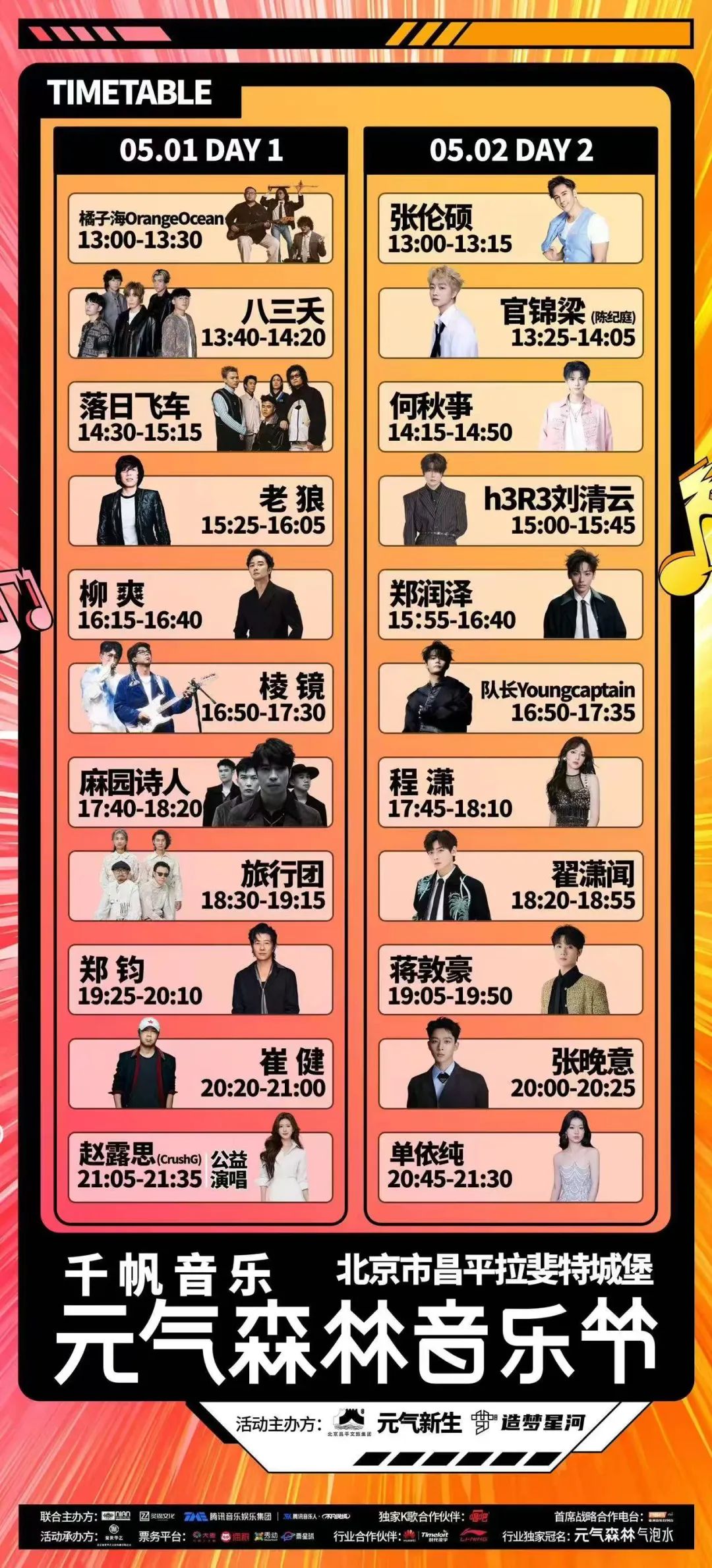 本次音乐会为期两天,邀请24组歌手、乐队接力献唱,这个五月注定不平凡!快来看看明天的日程安排吧~