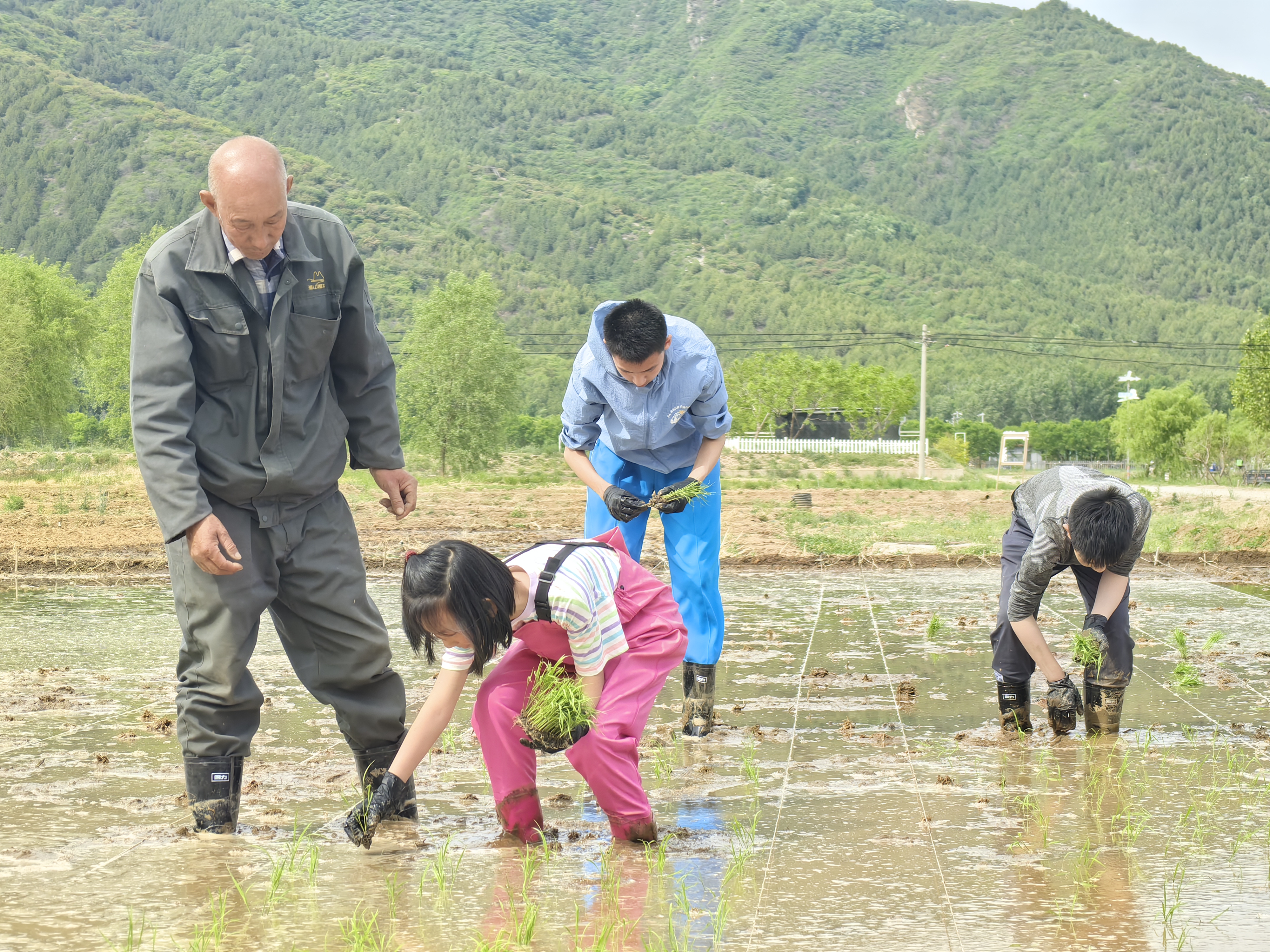 劳动节期间,孩子们穿上胶鞋,踏入水田,亲身体验水稻插秧的过程。“五一”假期,不少市民来到怀柔区的漫山慢水·小毛驴农场参与田间劳作,感受劳动的魅力。