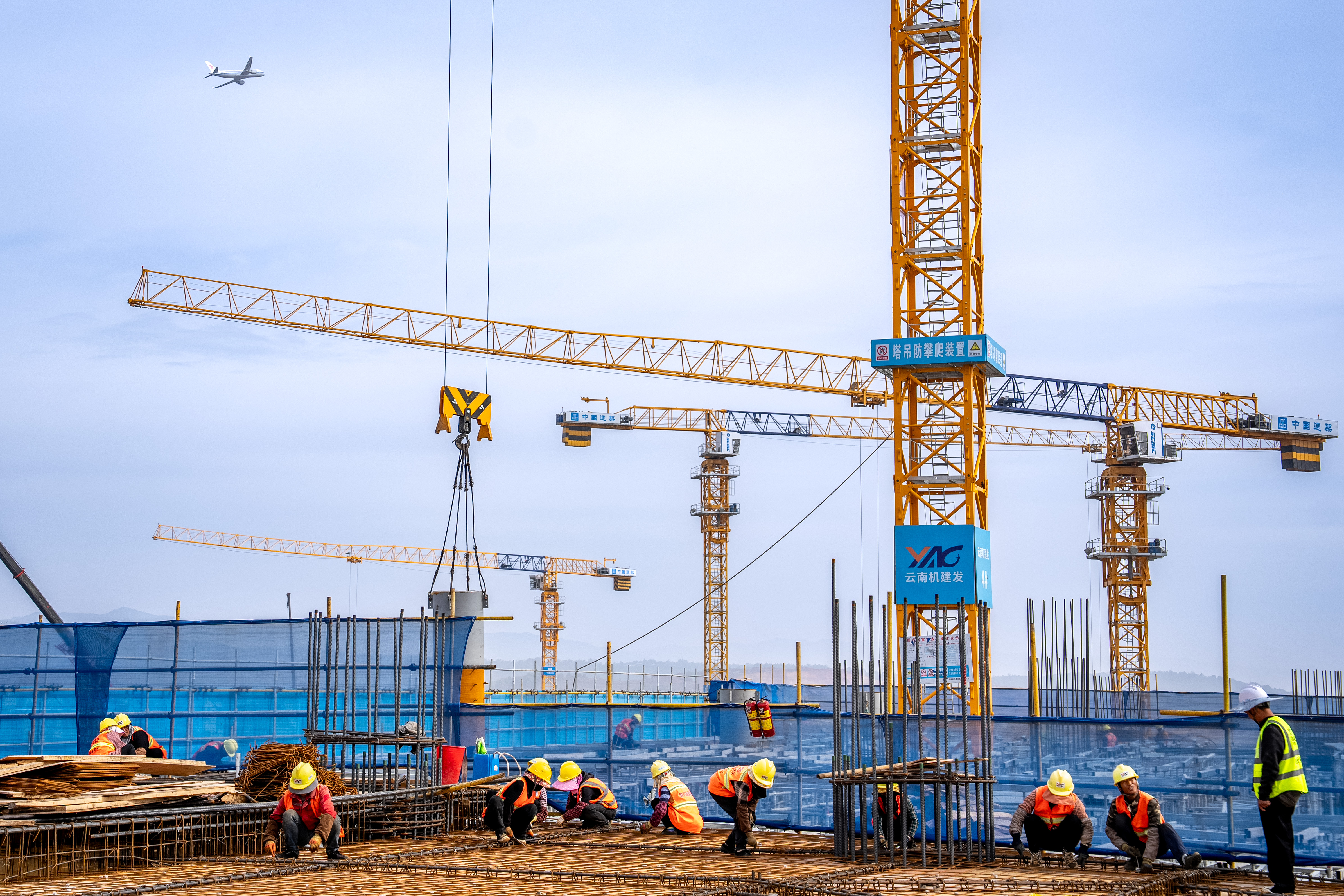 5月1日,云南机场建设发展有限公司建筑工人在昆明长水国际机场T2航站楼项目工地作业。