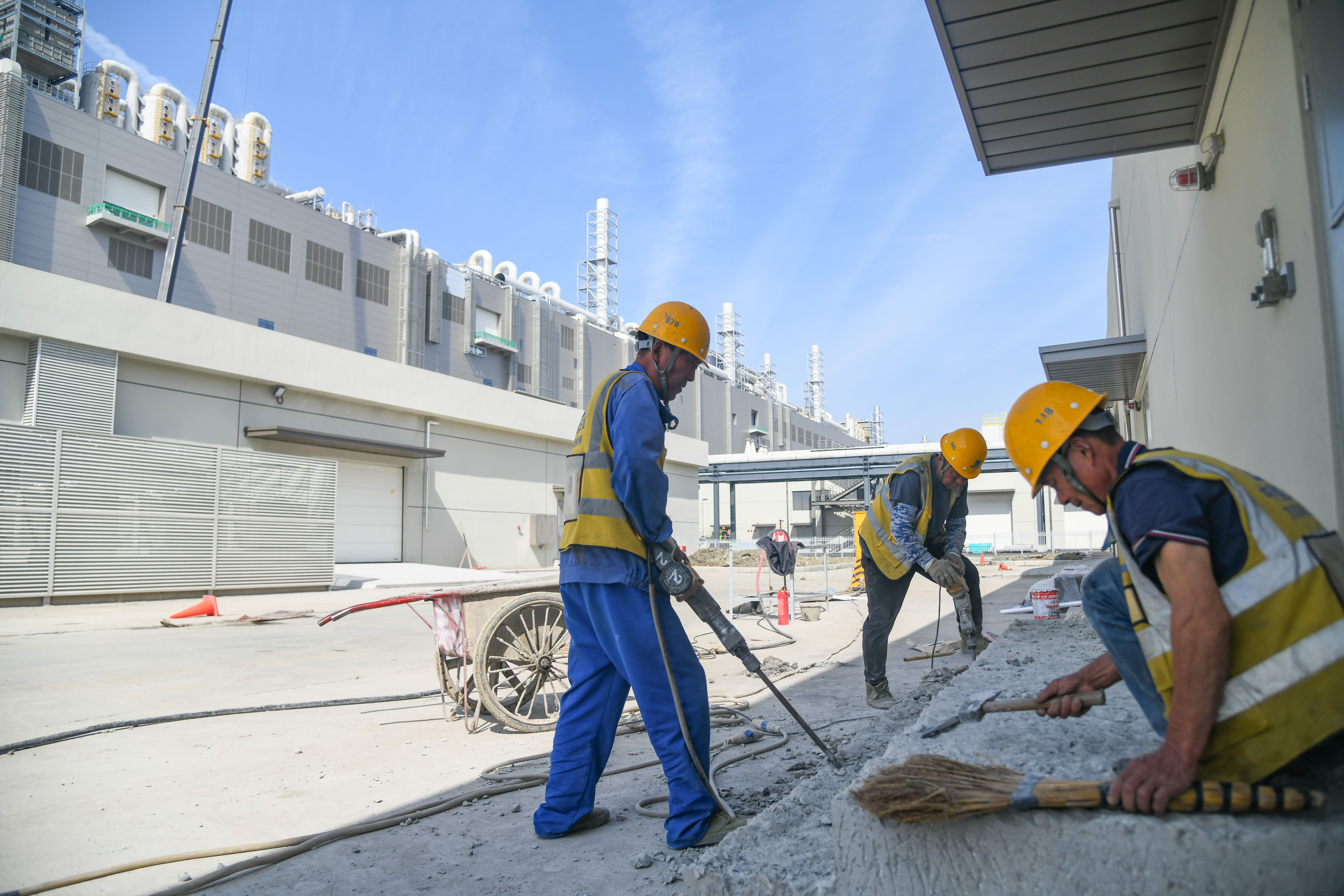 5月1日,建设者在中建三局四川成都京东方第8.6代AMOLED生产线项目建设现场施工作业。