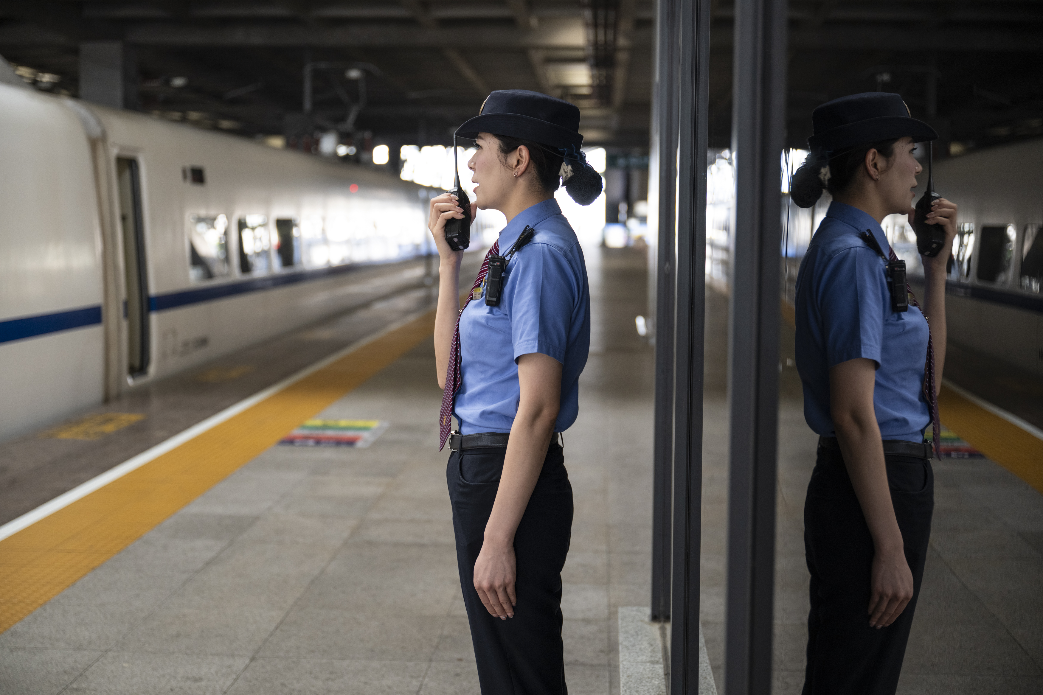 5月1日,客运值班员在武汉汉口站站台执勤。