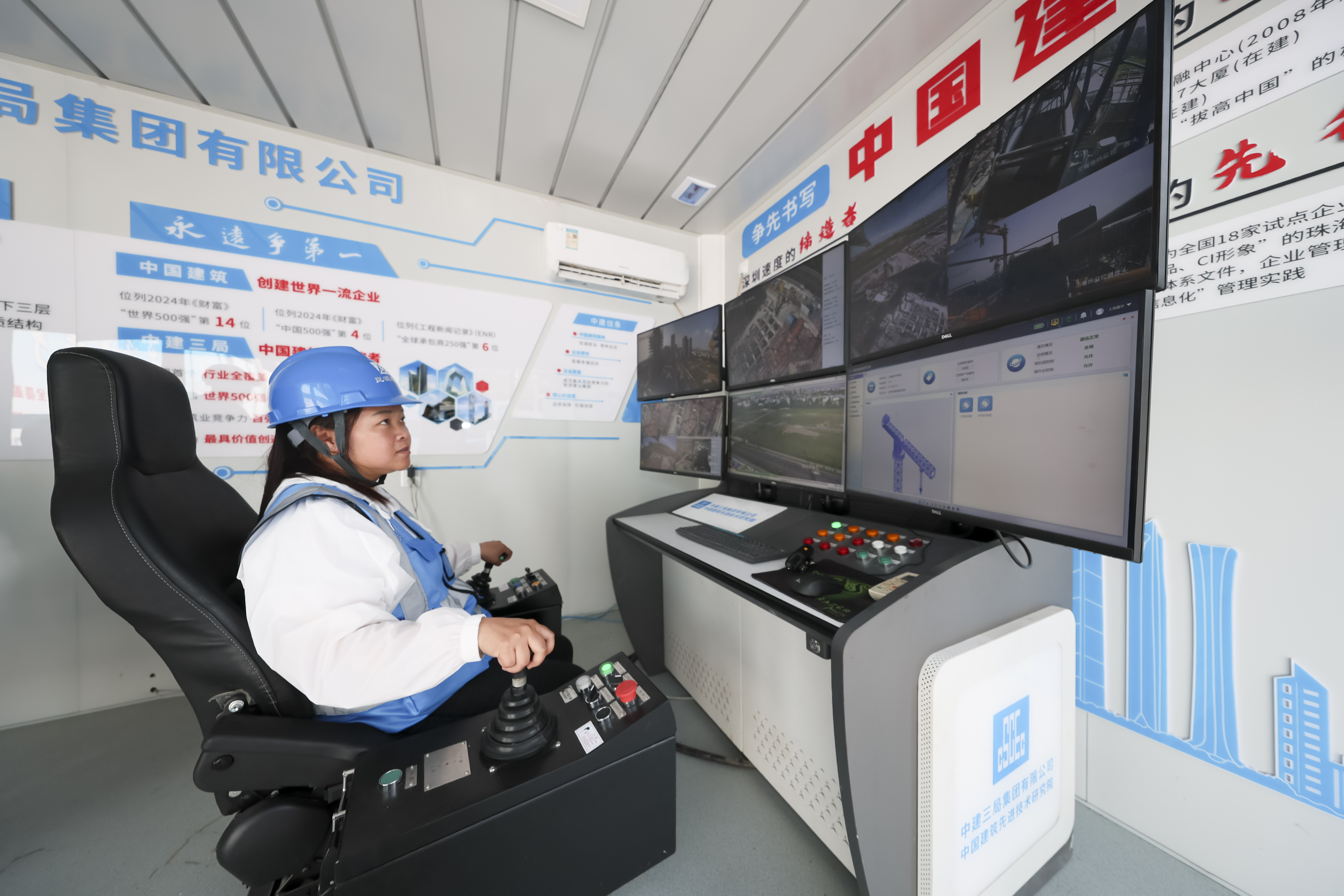 5月1日,中建三局华东公司塔机操作人员在5G塔机集控驾驶舱内远程操控塔吊。