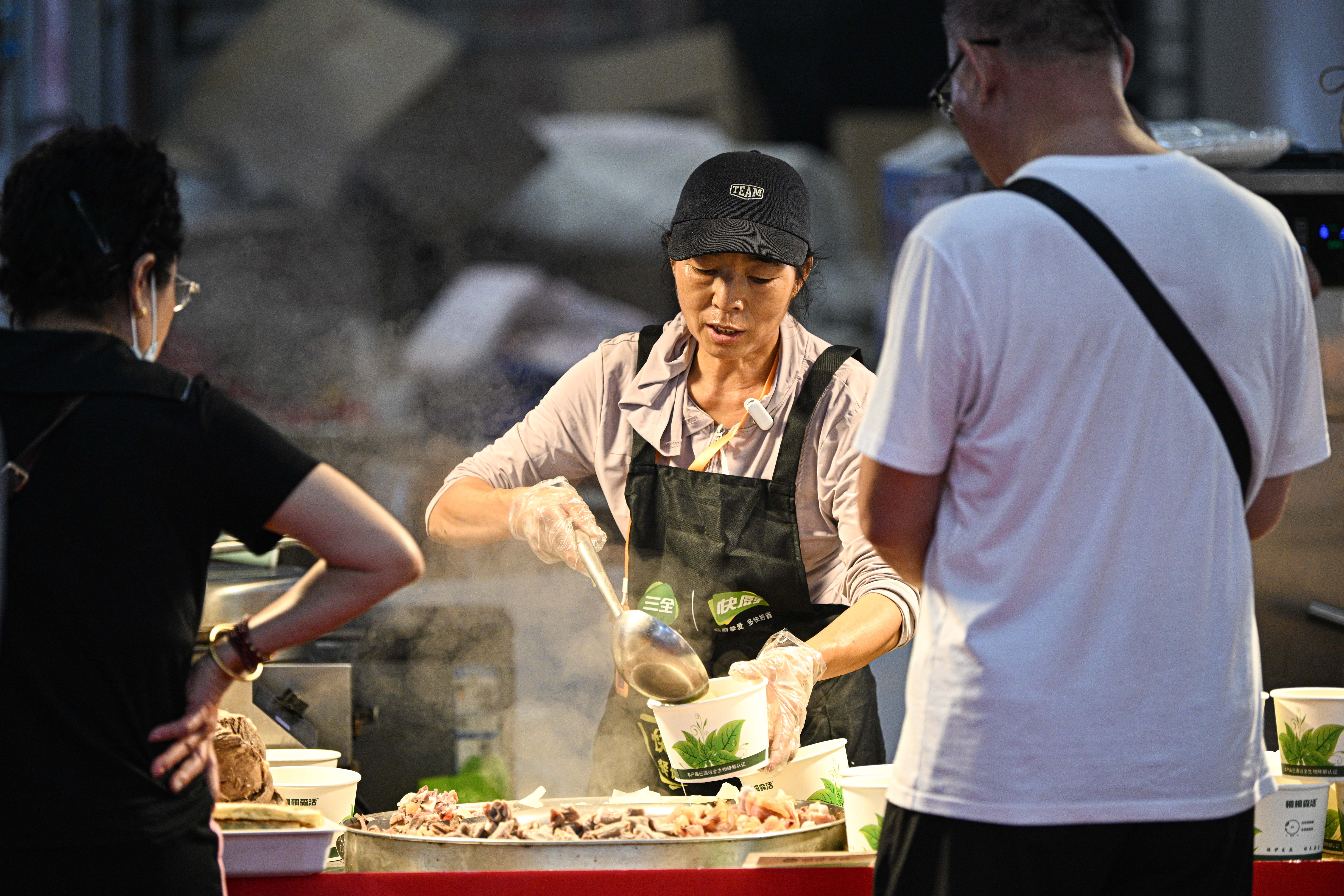 5月1日,在海南国际会展中心,商家为顾客制作牛杂粉面。