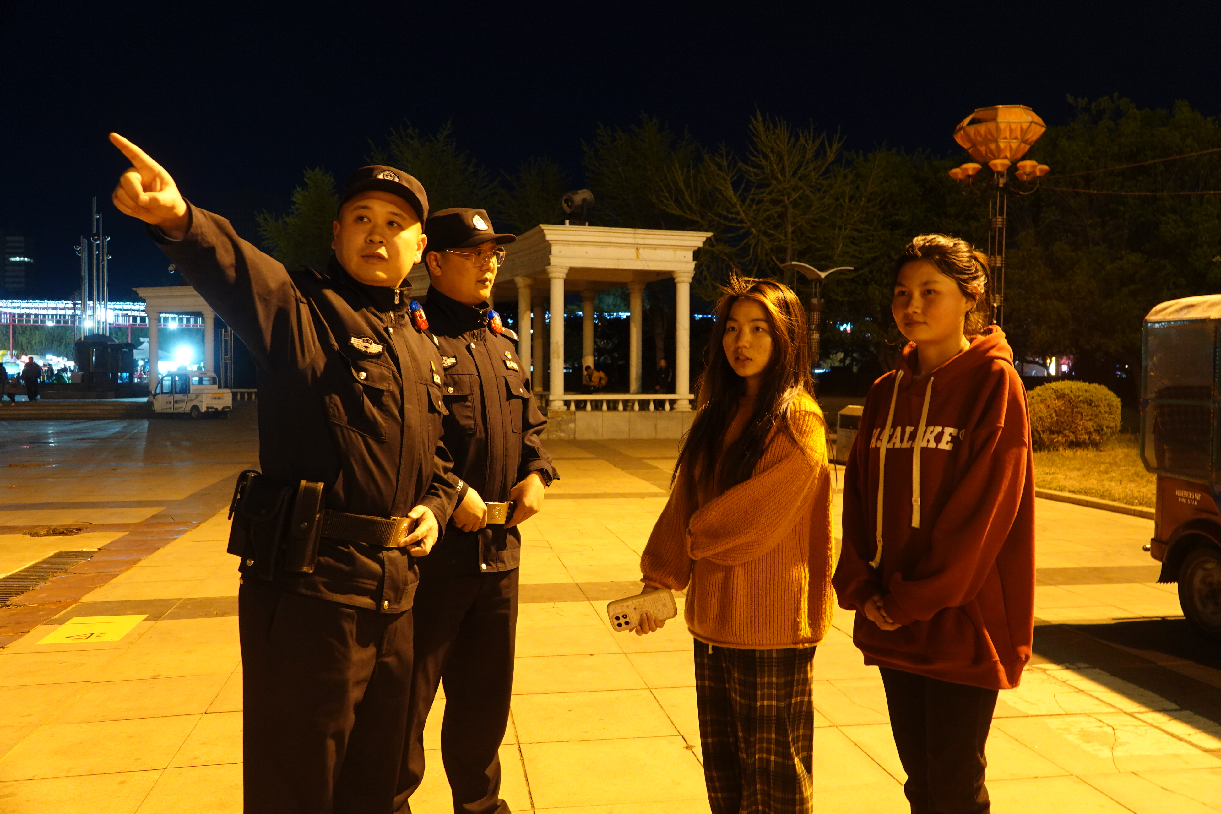 5月1日,在辽宁省锦州市经济技术开发区海风广场,锦州市公安局经济技术开发区(滨海新区)分局民警在夜间巡逻时回答外地游客咨询。