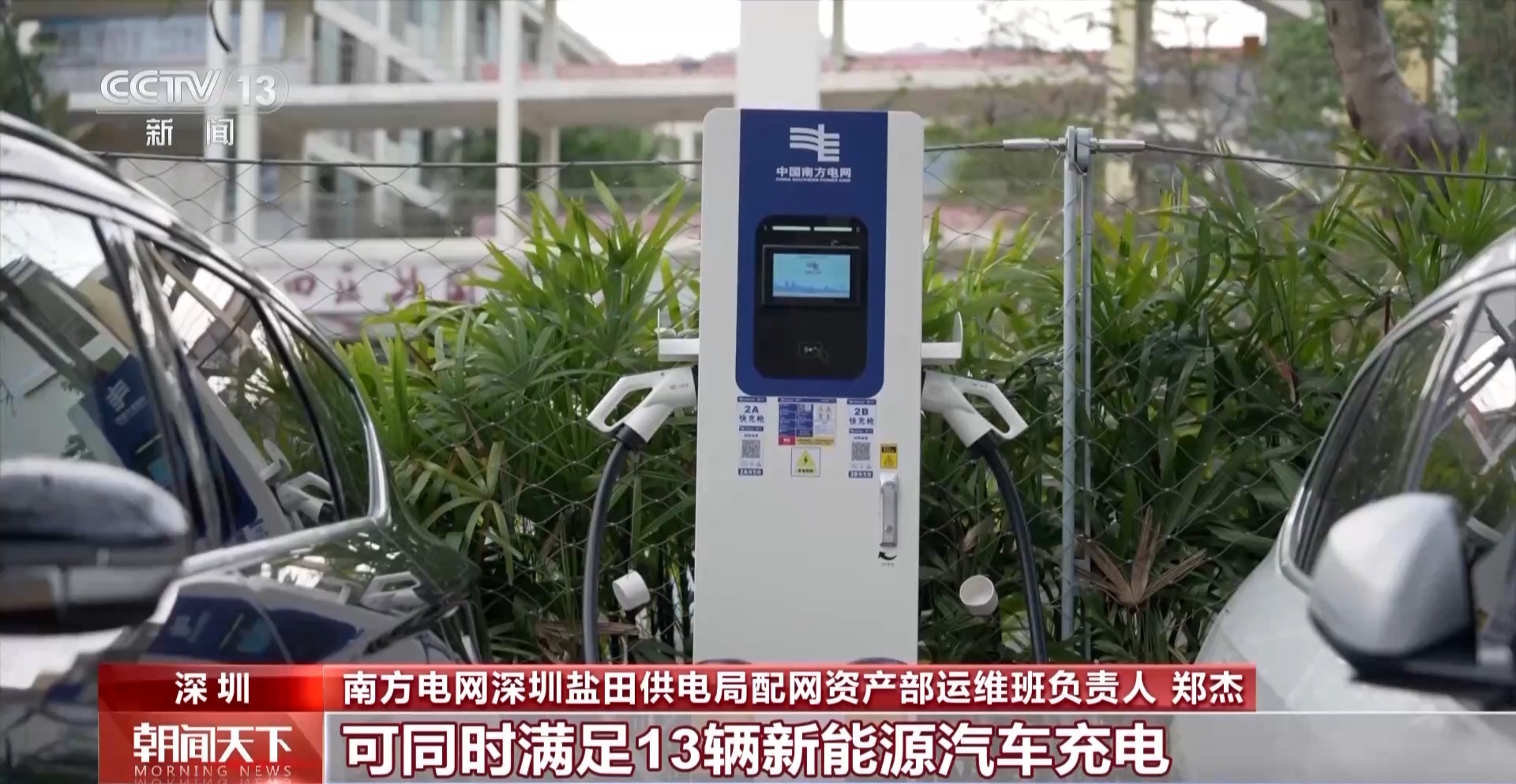 南方电网深圳盐田供电局配网资产部运维班负责人 郑杰:园区内还配备快充、慢充、V2G(汽车对电网)等充电桩,可同时满足13辆新能源汽车充电。