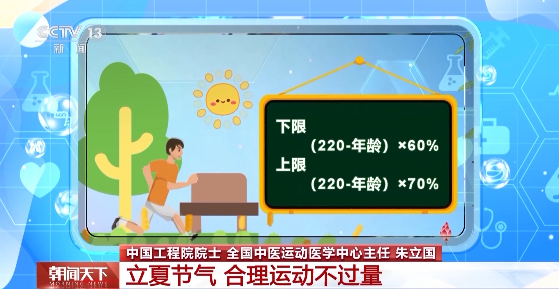 中国工程院院士、全国中医运动医学中心主任 朱立国:我们的心率一般在中度训练中有一个上限和下限,简单的公式是,上限是220减去年龄,再乘以60%,达到这种心率才起到锻炼的目标。上限尽量不要超过220减去年龄,再乘以70%。