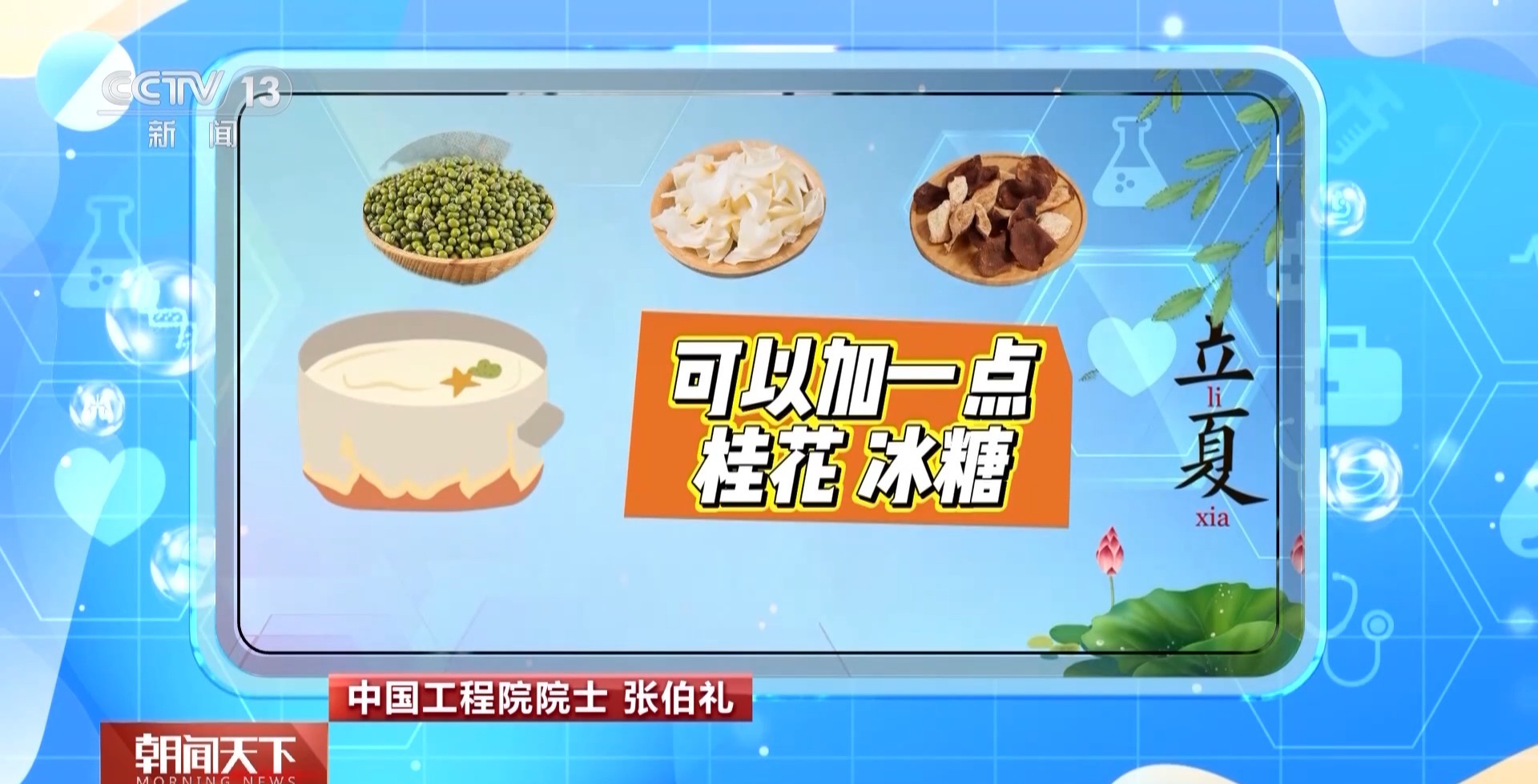 中国工程院院士 张伯礼:我推荐一个药膳——绿豆百合桂花汤。天气炎热,喝一喝这个汤,能够清热去暑、安神。它用绿豆50克、百合20克,加上陈皮10克共同来煮。提前把绿豆泡一个小时,泡松软和百合、陈皮一起来煮,煮到软烂了,可以加一点桂花、冰糖,这种老少咸宜。