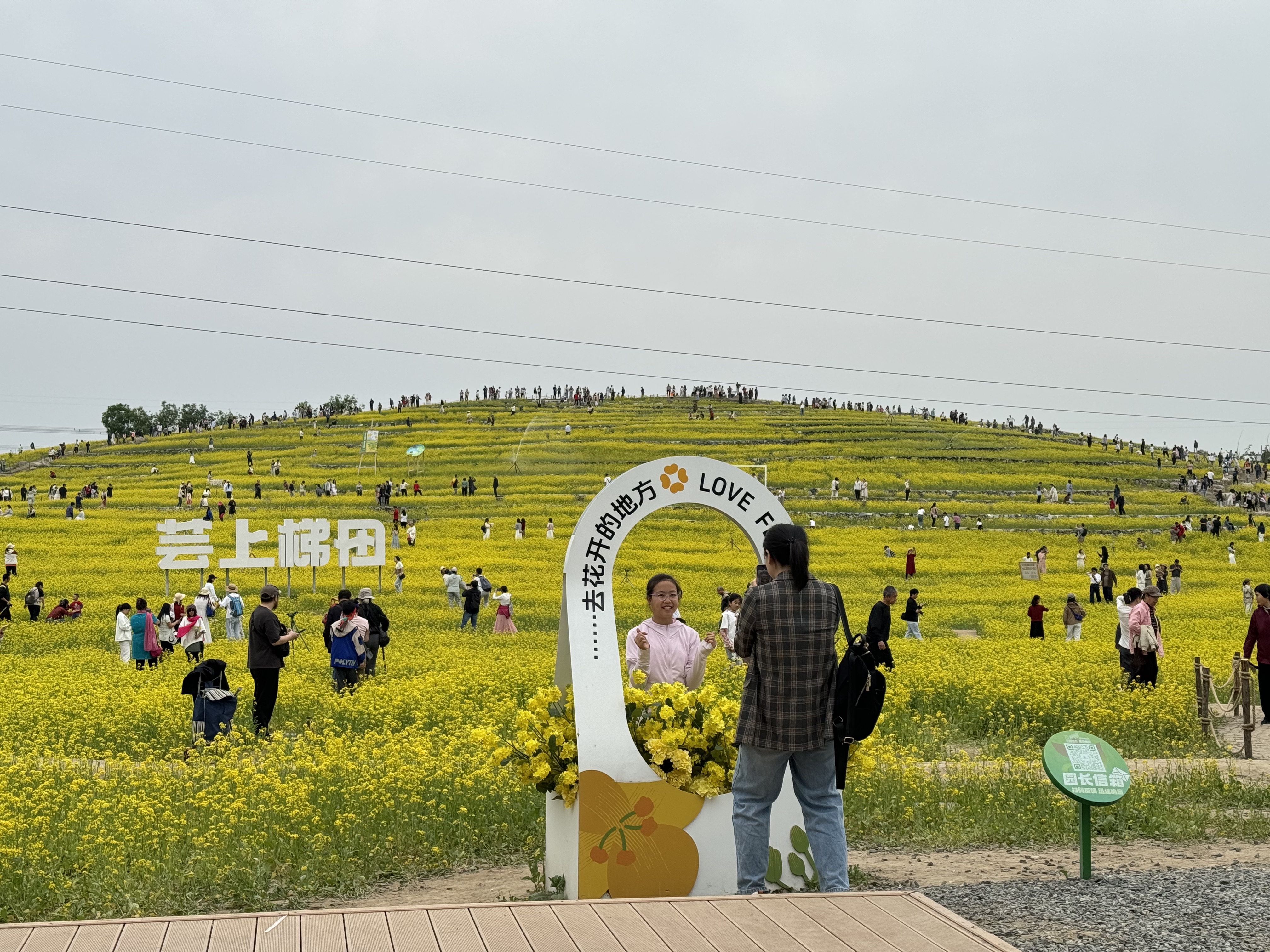 “菜籽油就是油菜籽榨出来的食用油,每公顷油菜田大约可榨出500公斤左右的菜籽油……”层层叠叠的油菜花海中,还有不少科普展板,让游客们在赏景的同时也能增长知识。每隔一段区域,都有公园的安保秩序员值守,时刻提醒游客注意安全、请勿随意践踏花丛。