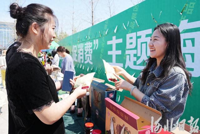 5月4日,在邢台任泽区人民广场农特产品展区,任泽区农业农村局工作人员(右)正在向游客推销农特产品。河北日报记者吕若汐摄