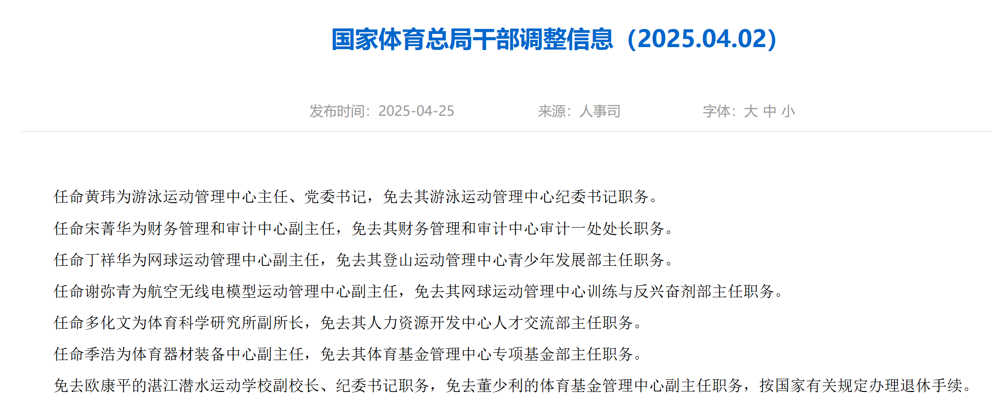 近日,国家体育总局网站发布干部调整信息。其中,任命黄玮为游泳运动管理中心主任、党委书记,免去其游泳运动管理中心纪委书记职务。
