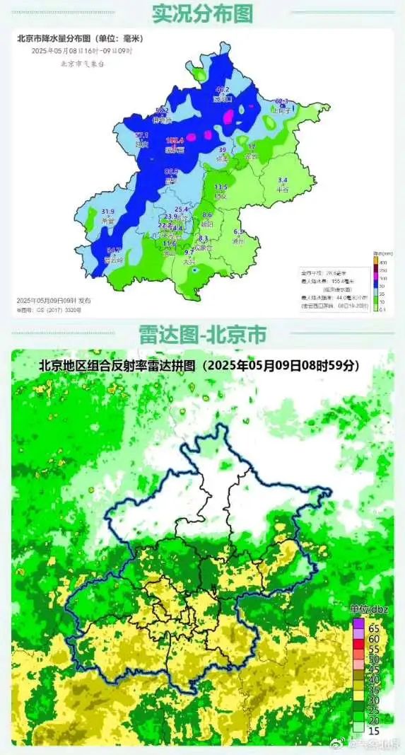 从北京市累计降水量图来看,西北部降雨要明显大于东南部,部分地区降雨量超过50毫米,局地达到100毫米以上。据统计,8日16时至9日09时,全市平均降水量28.8毫米,城区平均20.6毫米,西北部54.6毫米,西南部35.8毫米,东北部27.0毫米,东南部7.5毫米。最大降水量出现在延庆暖水面155.4毫米;最大降水强度出现在密云西白莲峪,08日19时-08日20时降水44.0毫米。最近一小时最大降水量为大兴魏善庄31.6毫米。