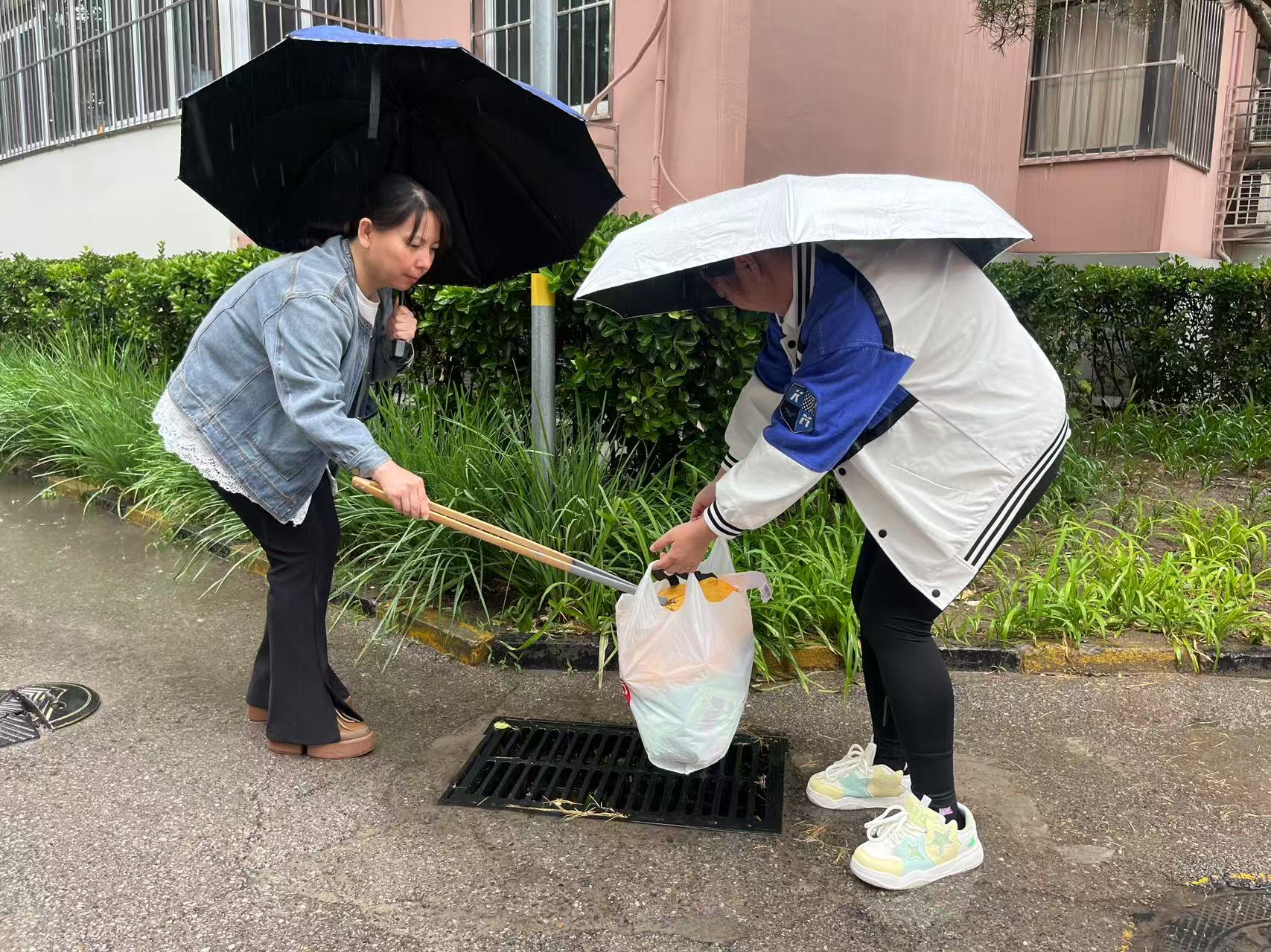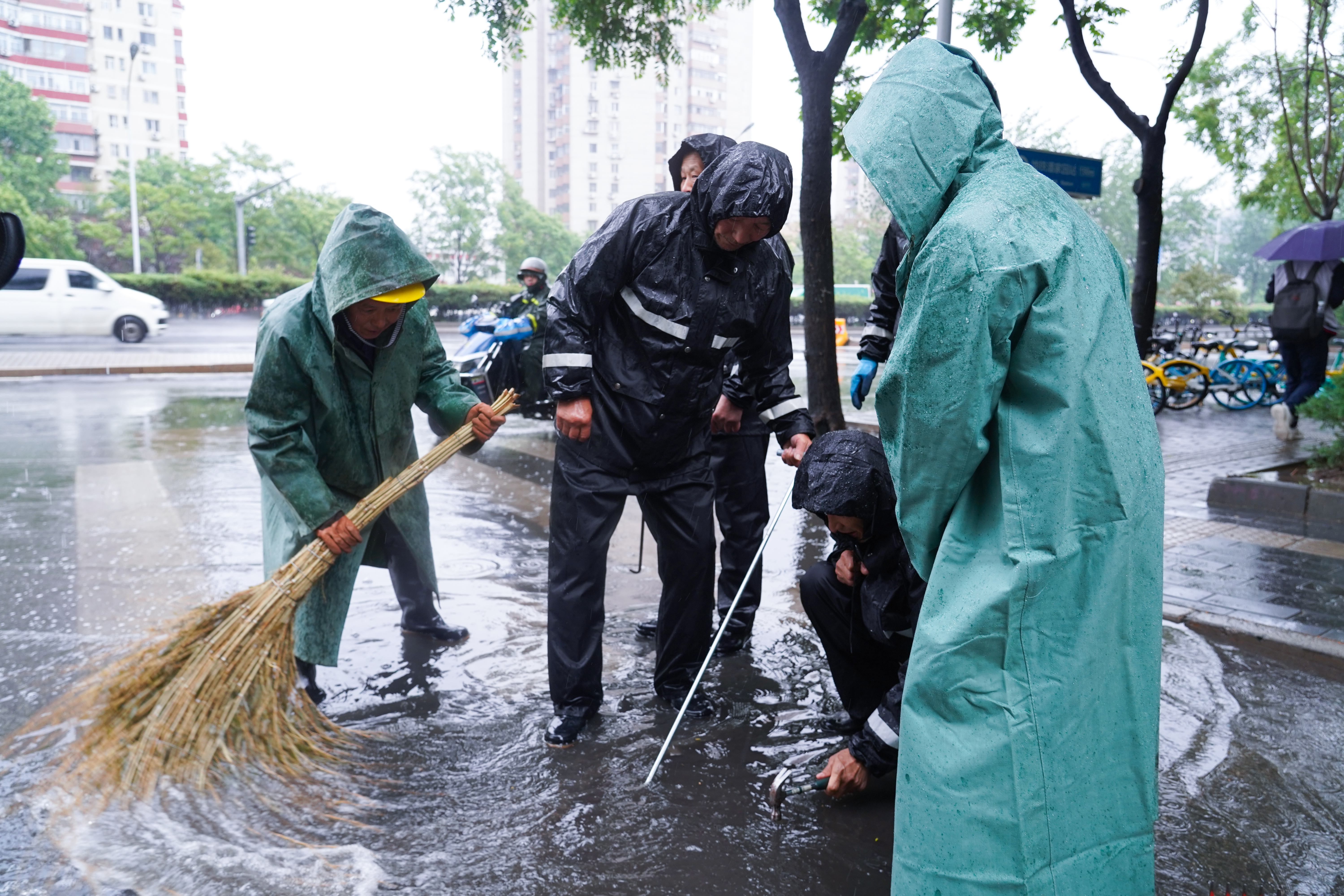 上午9时30分许,潘家园地铁站C口一派忙碌景象,来自潘家园街道的数位工作人员正在清理出口处路面积水。雨中,街道工作者们身穿雨衣、拿着扫把铁钩、踏着泥泞,在易积水点位进行“地毯式”巡查,及时排除了安全隐患,保证过路市民们雨天也能畅通出行。