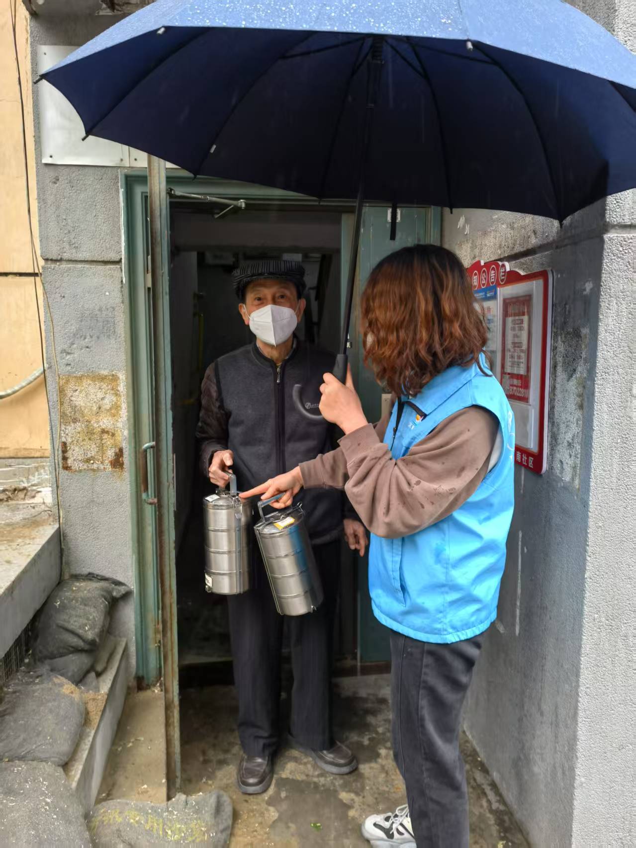 在华北南社区,面对突发降雨,社区启动“送餐”志愿服务队,为订饭的空巢老人送餐上门,做好居民生活保障服务,带去浓浓暖意。