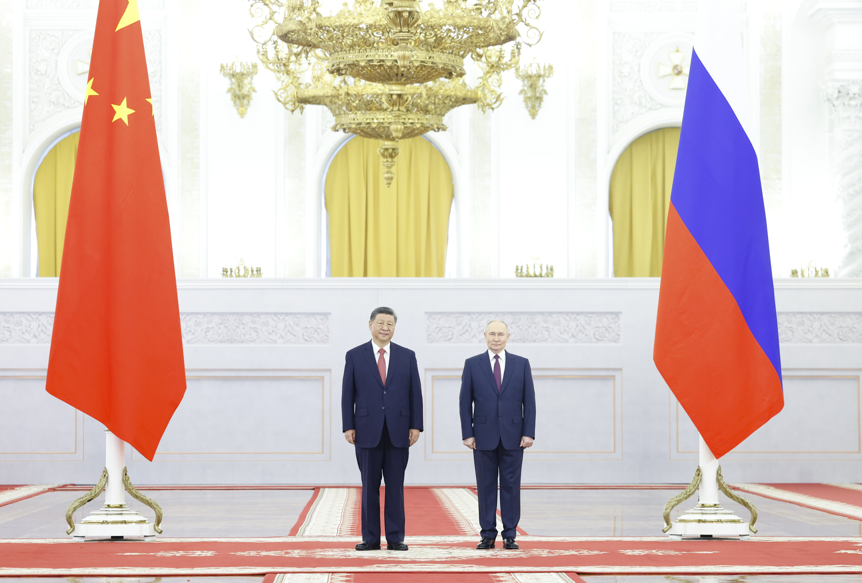 当地时间5月8日下午,普京同习近平在克里姆林宫总统办公室进行茶叙。
