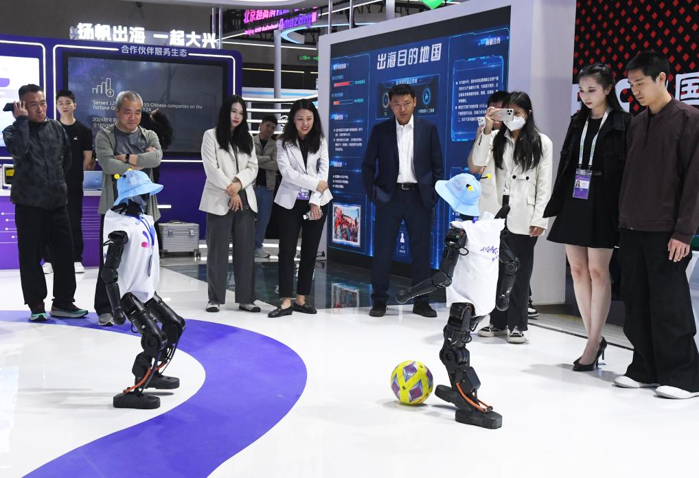 5月8日,机器人在第二十七届中国北京国际科技产业博览会大兴展台展示踢足球。新华社记者 任超 摄