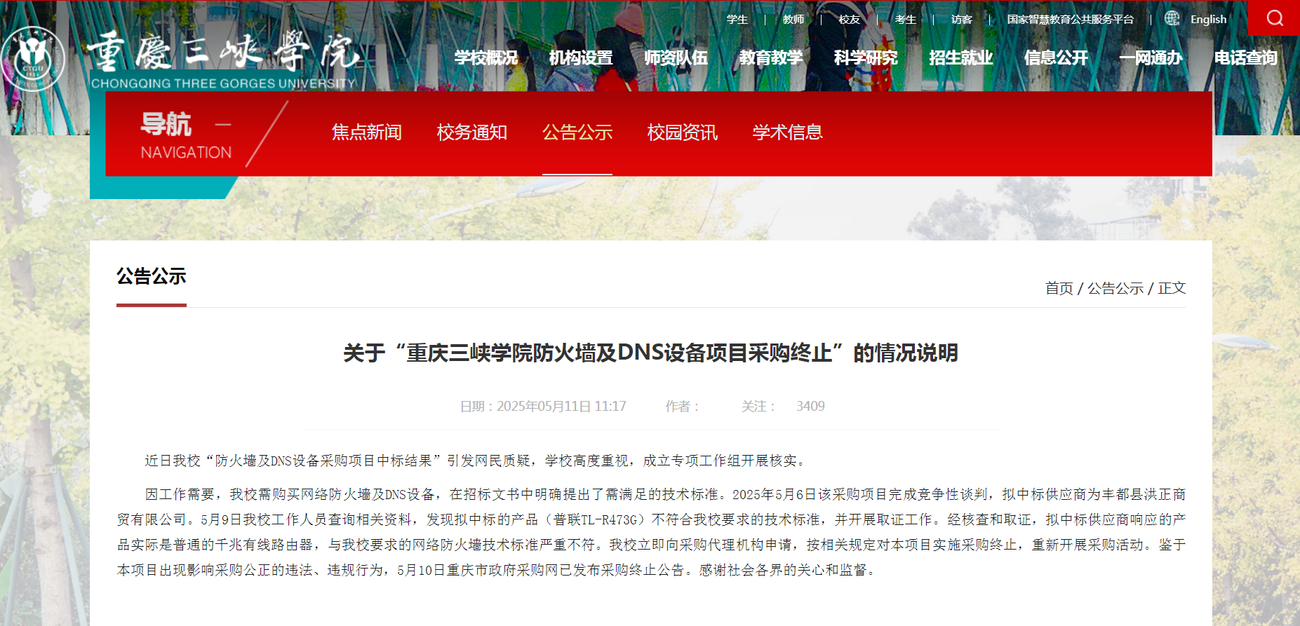 5月11日,重庆三峡学院在官网回应称,经核查和取证,拟中标供应商响应的产品实际是普通的千兆有线路由器,与学校要求的网络防火墙技术标准严重不符,已终止采购。