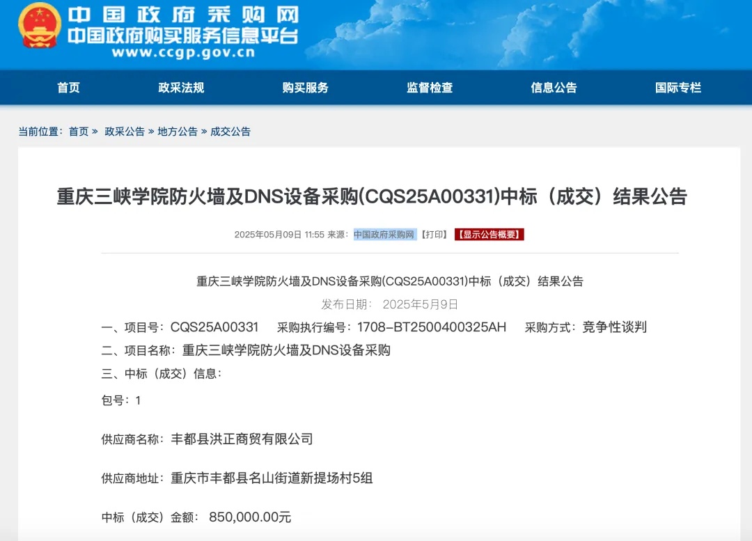 日前,重庆三峡学院发布“防火墙及DNS设备采购中标(成交)结果公告”,1台普联“TL-R473G”的设备中标价85万元。有网友提出,该款设备在网购平台售价不到300元,引发广泛关注。
