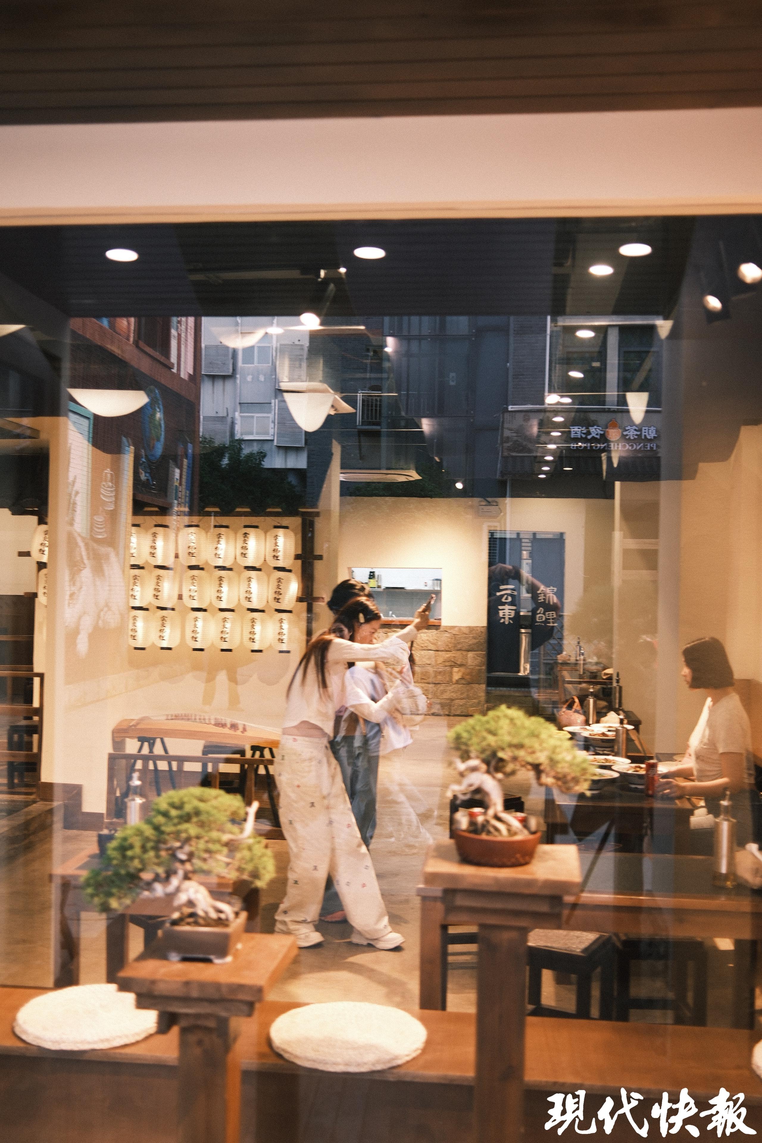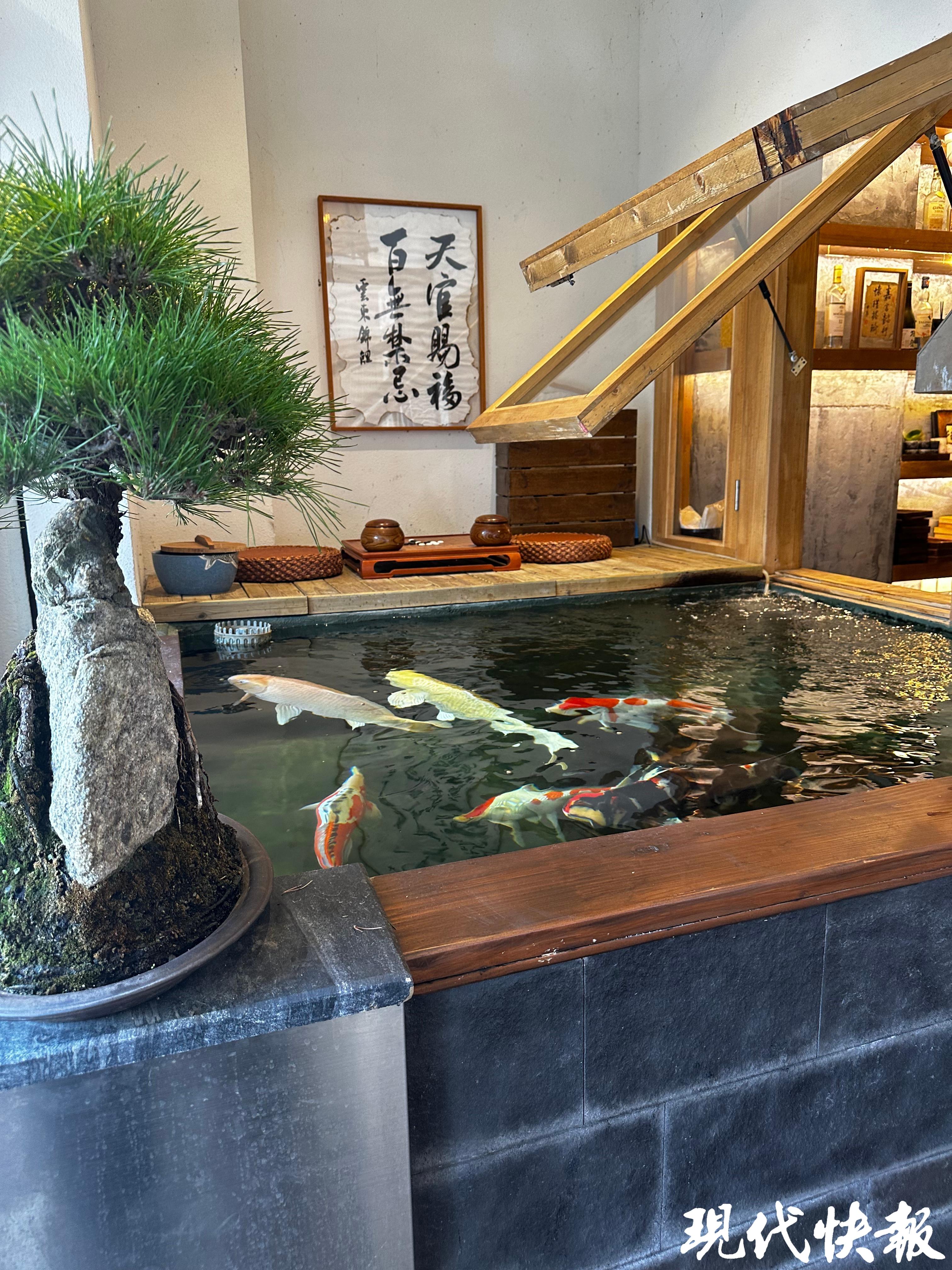 负责品牌设计和企划的马文圣开始大展拳脚,店内装修设计以中式古风为基调,在室内搭建屋顶造型,意在“上房揭瓦”,室外同时布置锦鲤鱼池,供游客赏鱼打卡。周末安排现场古筝弹奏,进一步提升氛围。
