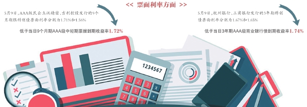 例如,5月9日,AAA级民企立讯精密、吉利控股发行的9个月期限科创债票面利率分别为1.71%和1.56%,低于当日9个月期AAA级中短期票据到期收益率1.72%;同日,杭州银行、工商银行发行的3年期科创债票面利率分别为1.67%和1.65%,也低于当日3年期AAA级商业银行债到期收益率1.74%。