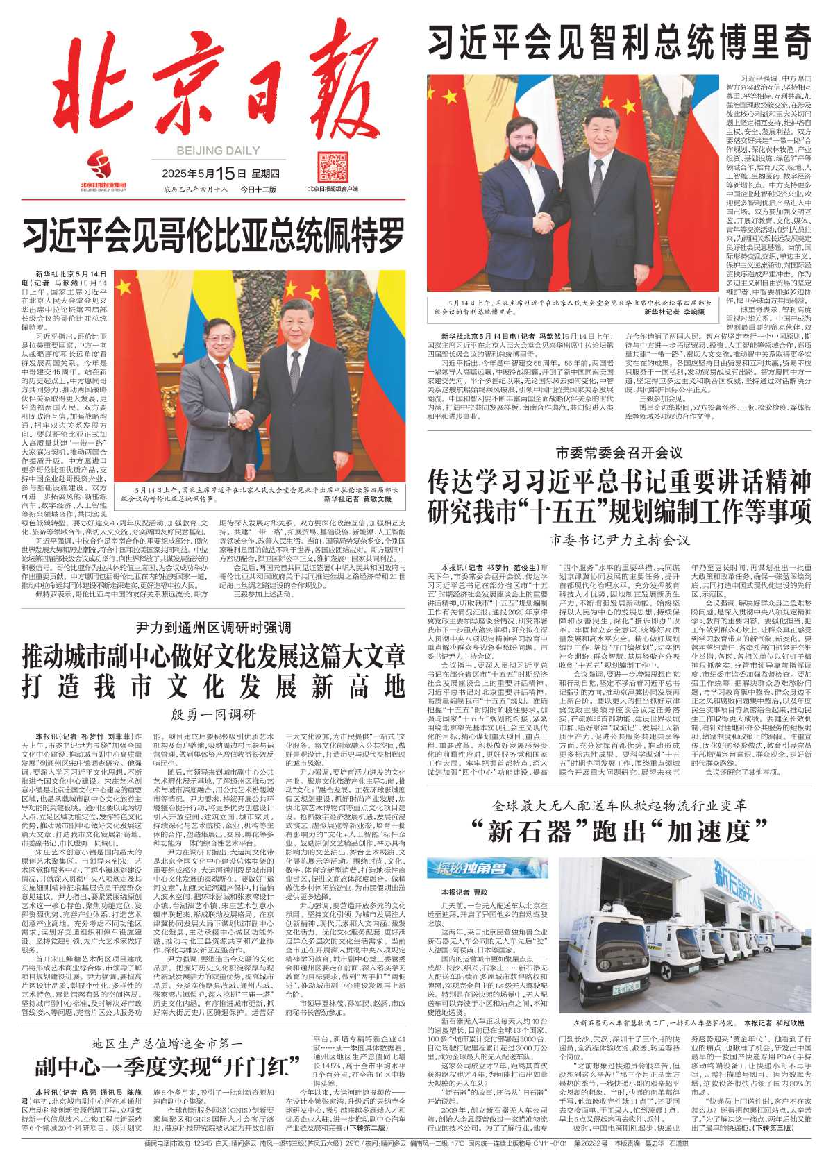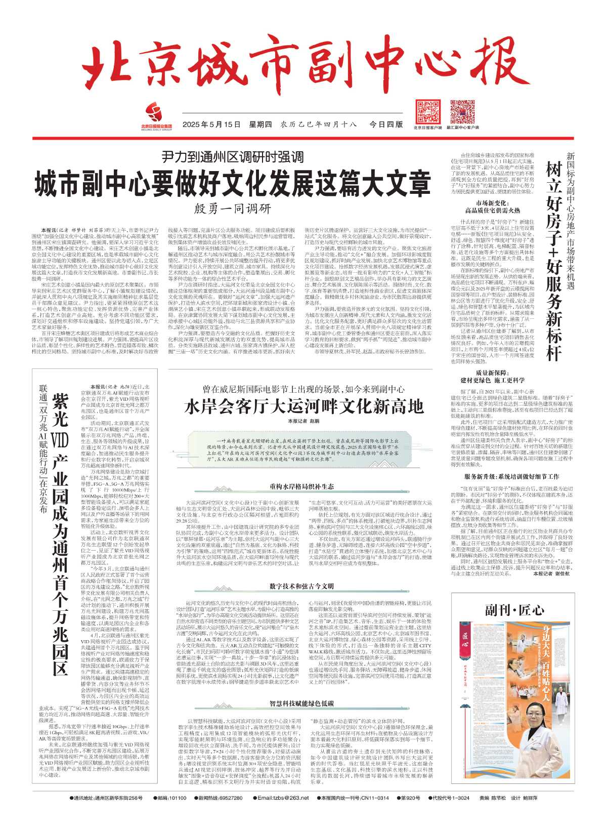 昨天上午,北京市委书记尹力围绕“加强全国文化中心建设,推动城市副中心高质量发展”到通州区宋庄镇调查研究。他强调,要深入学习习近平文化思想,不断推进全国文化中心建设。宋庄艺术创意小镇是北京全国文化中心建设的重要区域,也是承载城市副中心文化旅游主导功能的关键板块。通州区要以此为切入点,立足区域功能定位,发挥特色文化优势,推动城市副中心做好文化发展这篇大文章,打造我市文化发展新高地。详情>>