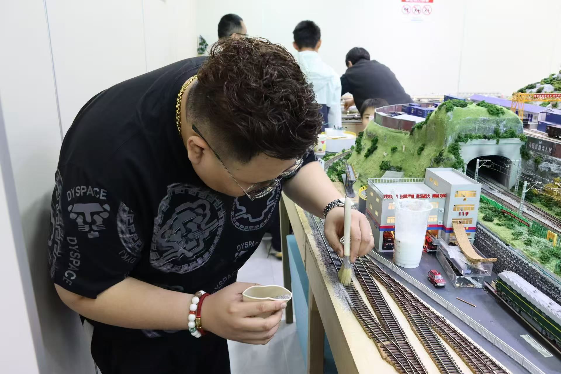 王梓晨表示,这是个非常细致的手艺活儿,自己非常喜欢这个过程,感到很治愈。王梓晨说着就向记者展示起来,只见他捻起一小撮沙粒,缓缓地撒在铁轨下,这是在使用沙粒模拟实景中铁轨下的碎石。随后王梓晨用刷子将沙粒整齐归拢在铁轨两侧,再用乳胶一滴一滴地点上去做固定。王梓晨说:“简单铺上木屑薄板,铁轨也能正常使用,但我们要做得更真实。因为我想,玩铁轨下的碎石,可能是很多人的童年回忆之一。”