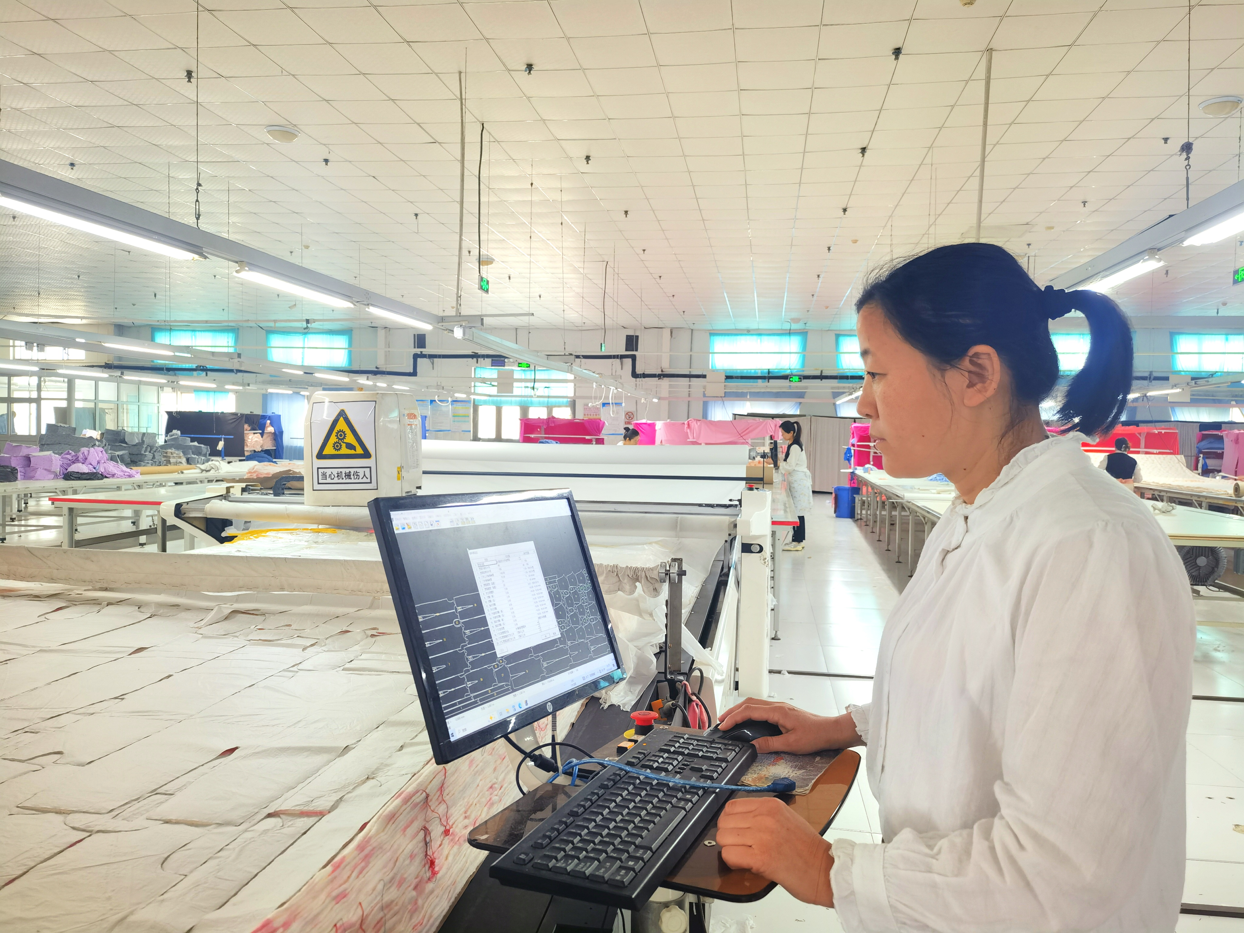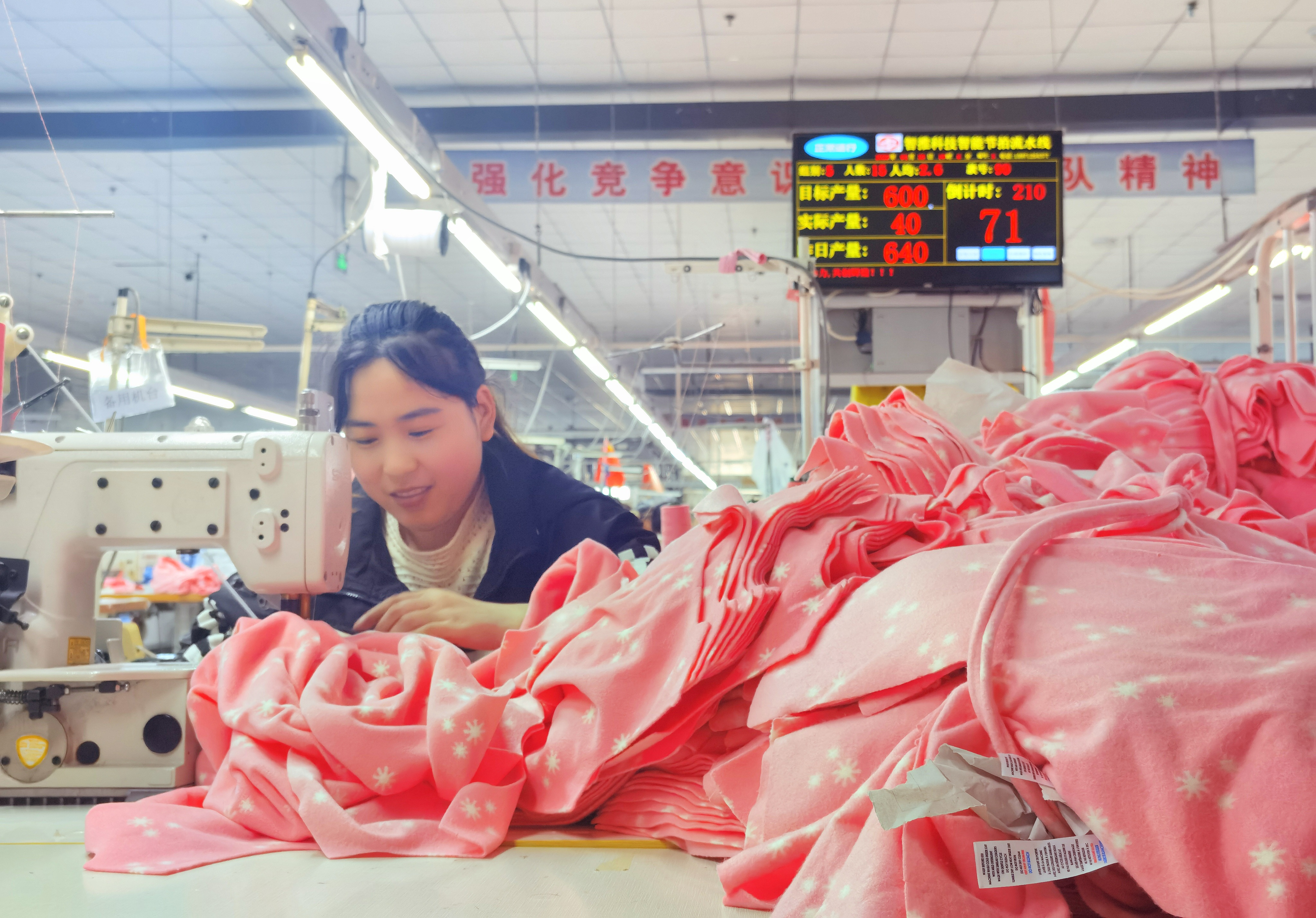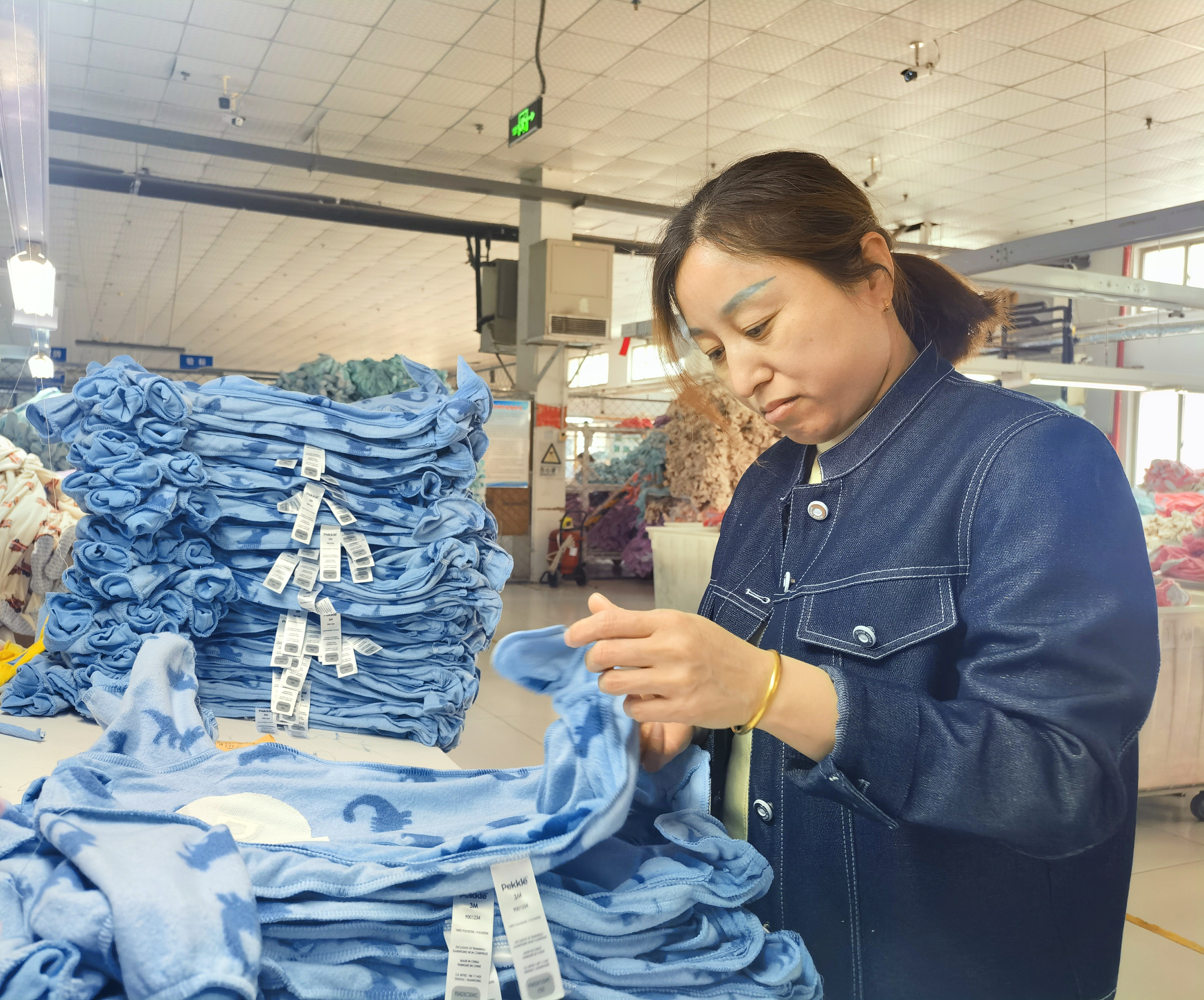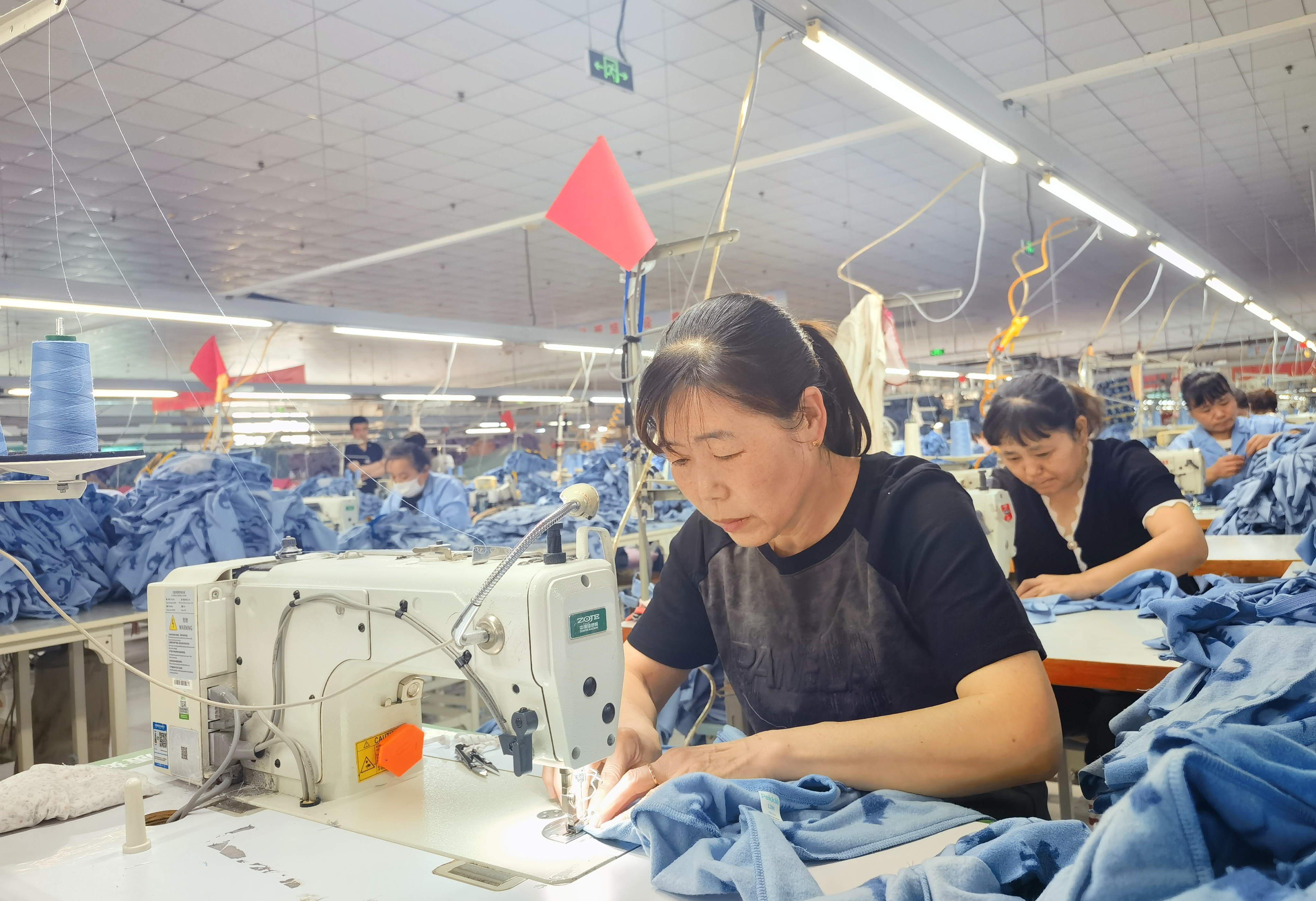 裁剪师熟练操控设备,伴随精准切割,一片片布料整齐落下;缝纫工手指如飞,细密针脚在布料间灵巧游走,一件件服装迅速成形……夜幕降临,记者来到山东夏津经济开发区费特制衣有限公司,生产车间里依然一派忙碌景象。