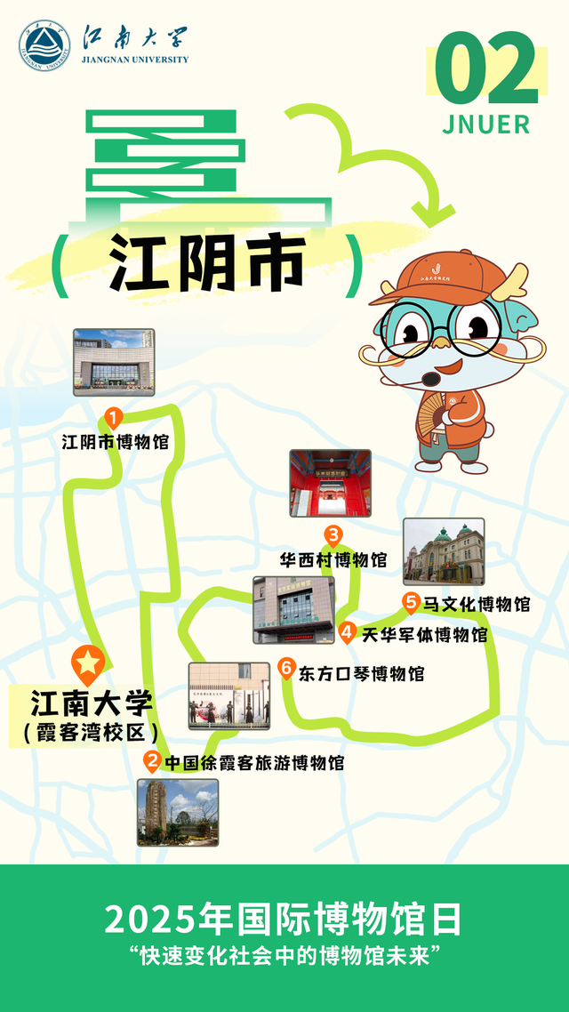 在第49个国际博物馆日即将到来之际,江南大学积极响应“快速变化社会中的博物馆未来”的主题,立足校园、联动社会,精心梳理了一条融合无锡地域特色的文博研学路线,带领青年学子在沉浸式体验中探寻文化根脉,感受传统与现代的碰撞,引领当代青年在传统与现代的对话中,共同书写属于这个时代的江南新故事。