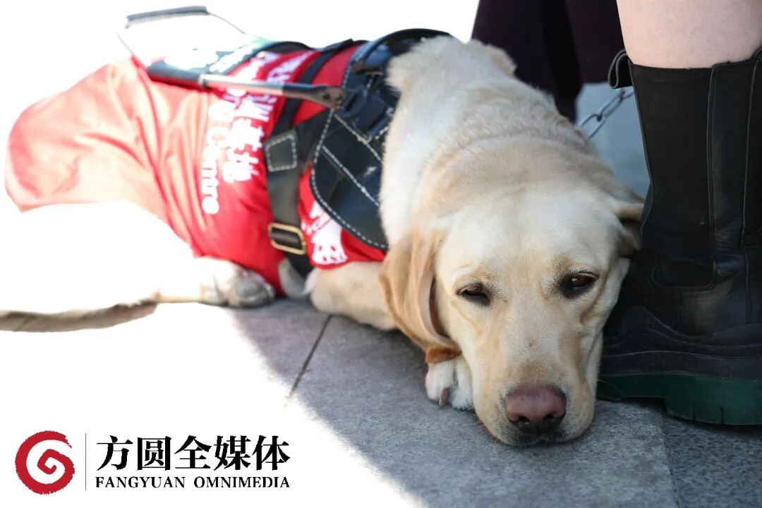 ▲在外出为张女士引路的间隙,导盲犬“前锋”轻卧并守护在张女士脚边。