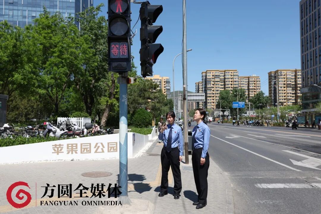 ▲北京市石景山区检察院检察官来到北京市石景山区苹果园大街十字路口,查看过街音响提示装置是否正常运行。