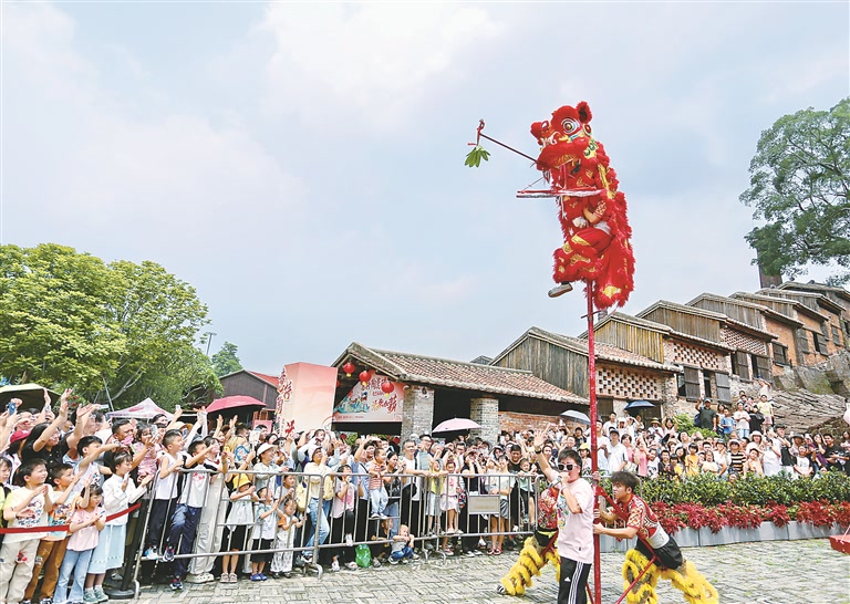 “五一”假期期间,各地推出丰富多彩的旅游产品供给,加强文旅融合和科技赋能,提升管理水平和服务品质,带动旅游消费欣欣向荣。图为游客在广东省佛山市禅城区南风古灶旅游休闲街区观看醒狮表演。新华社发(黄继明 摄)