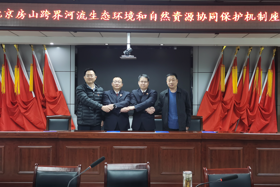 图为房山、涞水两地检察机关、河长制办公室签订跨界河流生态环境和自然资源协同保护机制会签仪式