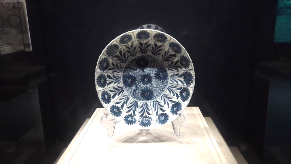 福州市博物馆讲解员张卓尔介绍了一件雏菊纹菱口盘。她说,“雏菊其实是意大利的一种花卉,是在19世纪由欧洲引入中国。但是在这件17世纪的青花瓷器上就可以见到雏菊纹这样的形制,验证了海上丝绸之路的交流和沟通。”