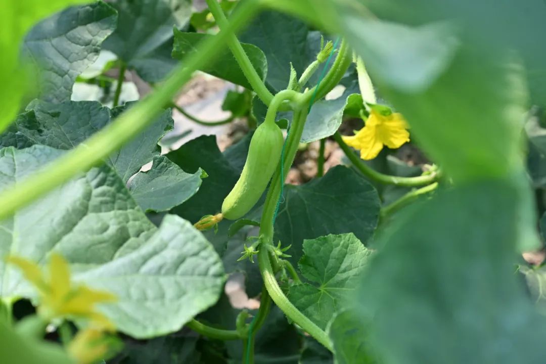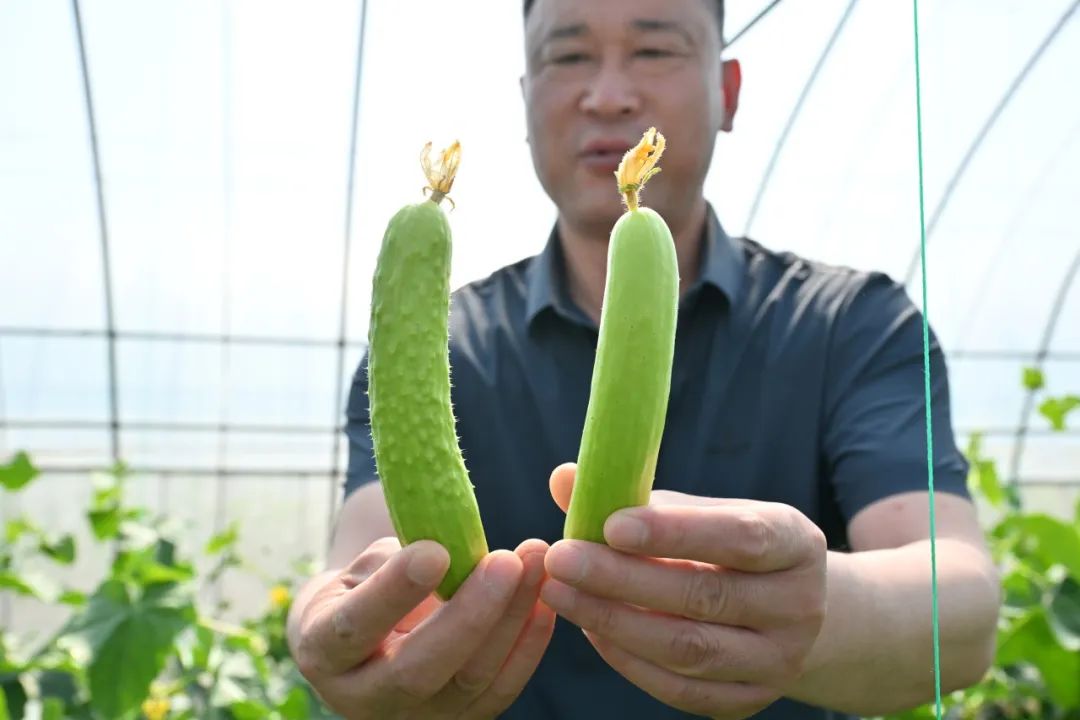 在标注着各种代号的黄瓜种植区里,拇指粗的白黄瓜挂满藤架。这些通体雪亮的瓜条表面布满细密的水珠,像裹着层冰霜。技术员轻掰一根,随着“咔嚓”脆响,断面渗出清透汁液。“您尝尝,这个品种的果肉像雪梨一样爽脆。”果然,咬下去的瞬间,清甜中带着淡淡奶香的汁水立刻充盈口腔。这是他们历时两年培育的实验新品种水果黄瓜,脆甜多汁,富含健身人群所需的高丙醇二酸;抗病性强,较普通品种增产30%,亩产达8000—10000斤;通过物联网系统实现水肥精准供给,品质稳定。
