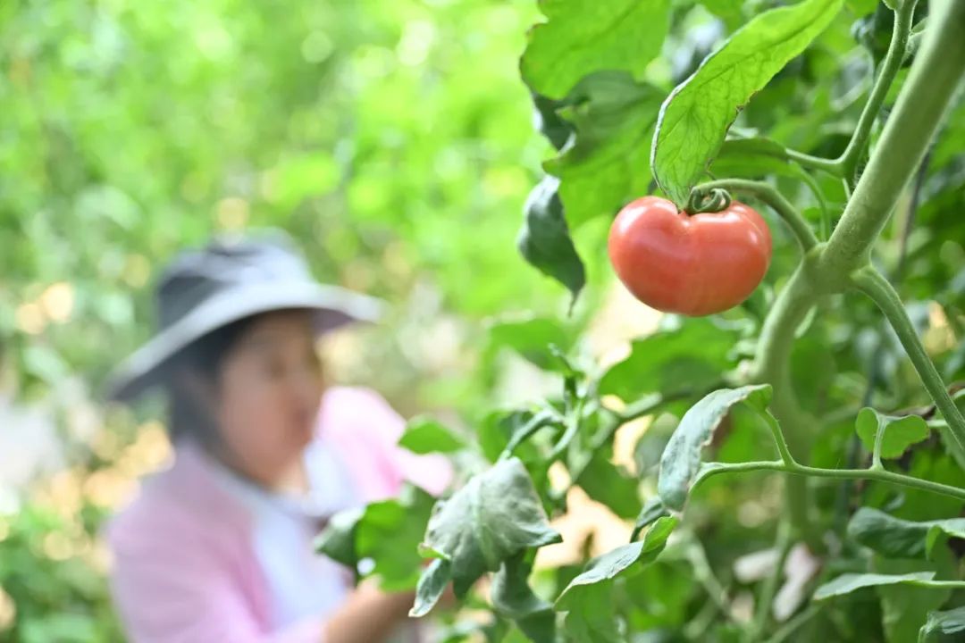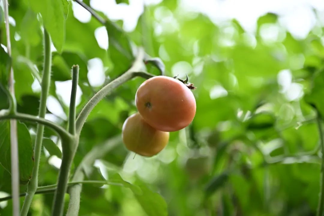 如今,精品番茄采摘正当时。夏日的番茄大棚里,成熟的果实压弯了藤蔓。阳光透过塑料薄膜洒下来,给红彤彤的番茄镀上一层金边。饱满的果实像一盏盏小灯笼,沉甸甸地挂在枝头,有些已经熟透的甚至把枝条都压得弯下了腰。走近了能闻到一股清甜的果香,夹杂着泥土的芬芳。偶尔有几只蜜蜂从掀开的棚膜缝隙钻进来,围着一簇簇番茄花打转。摘下一颗红彤彤的番茄,公司负责人高杰直接放进嘴里:“特甜,你们尝尝。”