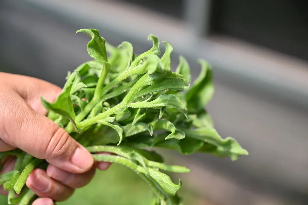 今年,这里还尝试引进了冰草。清晨采摘的冰草带着露水的清凉感,叶片边缘的透明结晶在阳光下会折射彩虹光晕。“入口时有类似苹果皮的清脆声响,随着咀嚼会释放出海藻般的鲜咸滋味,特别适合搭配酸奶酱或刺身酱油食用。”高杰介绍,这是一种引进自荷兰的驯化品种,叶片表面密布晶莹的“冰珠”状泡状细胞,富含天然植物盐与肌醇。该园区通过水培与土培结合方式,使成品叶片的脆嫩度提升40%,冷藏保鲜期延长至7天。