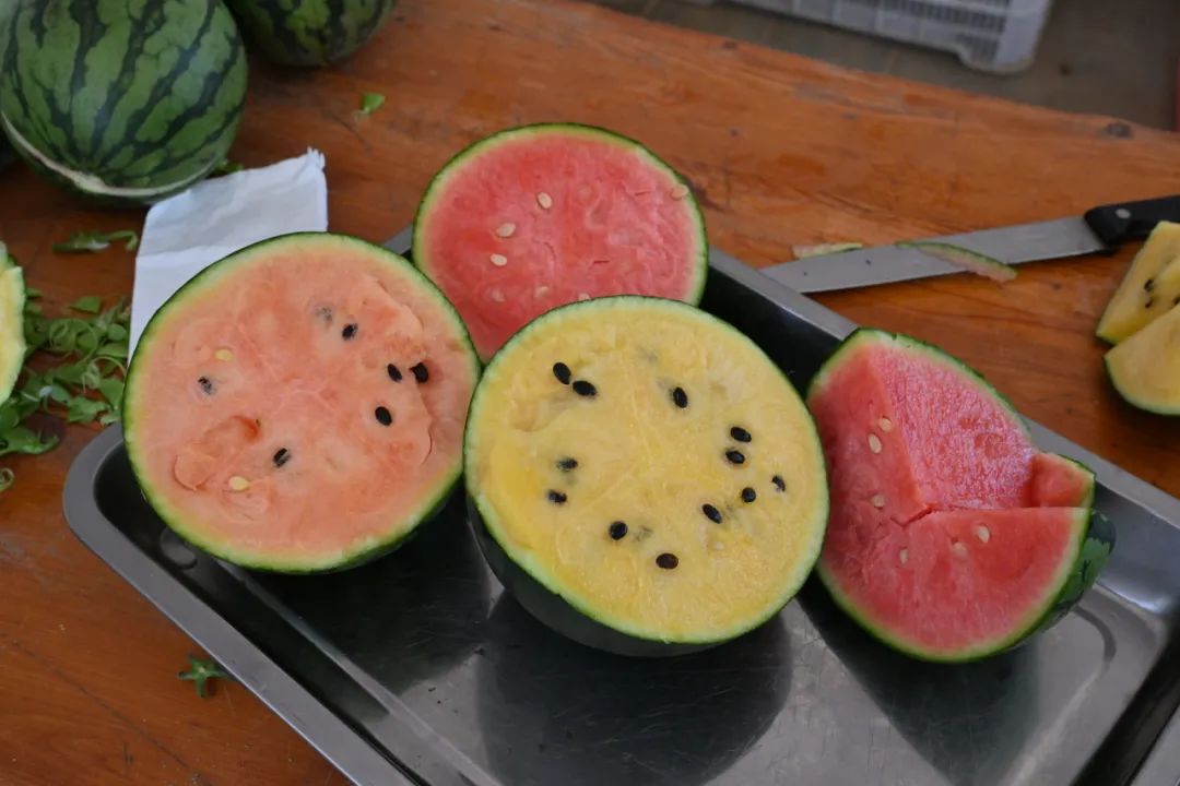 走进种植区,一颗颗圆滚滚的西瓜挂在藤曼上。墨绿色瓜皮上分布着锯齿状浅纹,阳光照射下形成明暗交错的迷彩图案。椭圆果型的炫彩2号包裹着如夕阳般澄明的橙黄色果肉,单果重 2公斤左右,专为都市小家庭设计,一次吃完无负担。炫彩4号橙粉相间的瓜瓤如晚霞渐变色,果肉细腻无渣,一刀切下,刀面几乎不沾果肉,堪称 “强迫症友好型” 西瓜。炫彩6号则是纯正的“暗黑系实力派”,黑皮自带哑光质感,切开后橙黄色果肉如宝石般闪耀,果实发育期仅 28 天,是早熟西瓜中的 “闪电侠”。