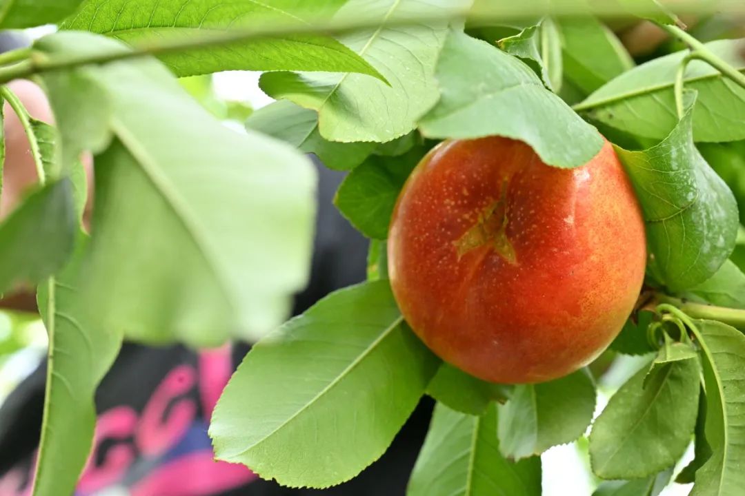 阳光在黄金蟠桃表面投下细碎光斑,果皮泛起蜜糖色的光泽。指尖轻触离核黄金脆的瞬间,能感受到果皮紧绷的张力,稍加施压便回弹如初。摘下时果柄发出清脆的“啪”声,断面渗出晶莹桃胶。紫密桃的表皮覆着天鹅绒般的绒毛,摩挲时产生微妙的静电吸附感。现场切开的丰味蟠桃露出珊瑚色果肉,汁水顺着刀锋成线滴落。第一口咬下时,先尝到皮下1毫米处浓度最高的甜,而后是果肉中段微妙的杏子酸,最后喉间泛起兰花似的回甘。“不同成熟度的桃子释放出层次分明的香气,七分熟的纽扣桃带着青柠与茉莉的清新,完全成熟的天后蟠桃则酝酿出蜂蜜与香草荚的醇厚。来这儿采摘,可以体验到‘桃园香氛’的景象。”周岩表示。