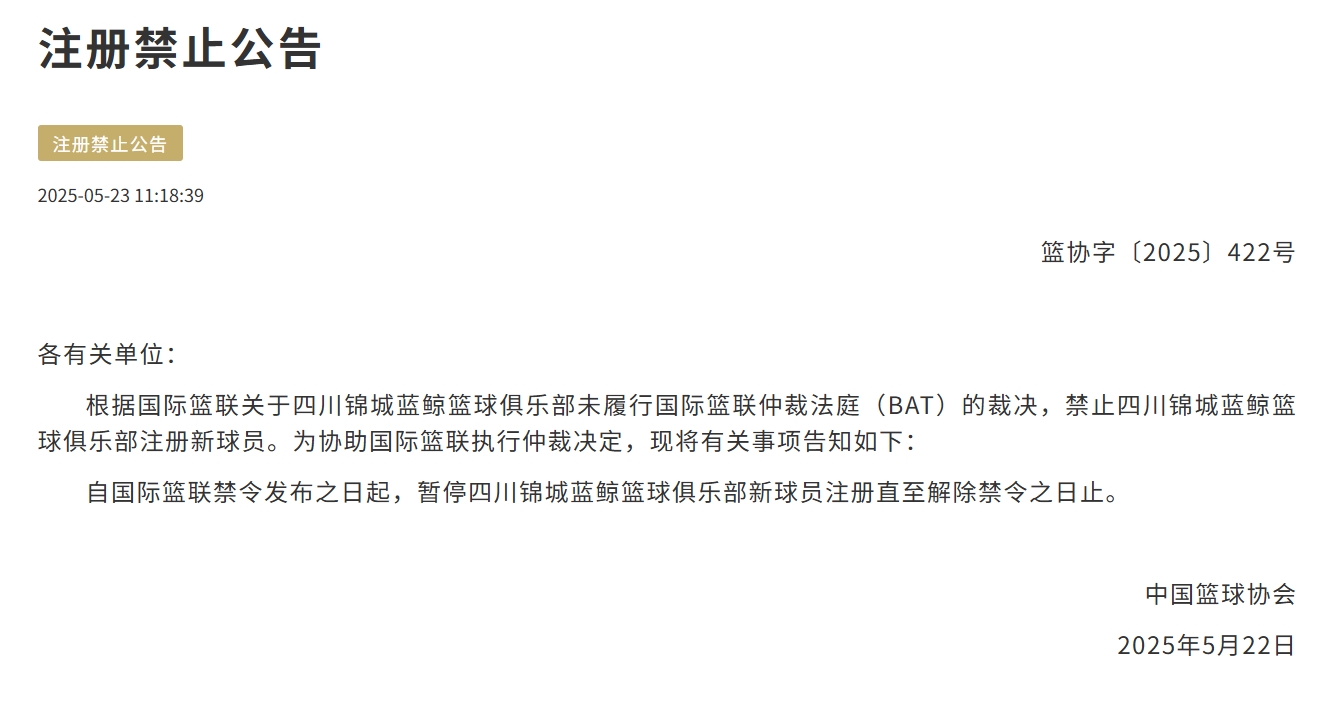 根据国际篮联关于四川锦城蓝鲸篮球俱乐部未履行国际篮联仲裁法庭(BAT)的裁决,禁止四川锦城蓝鲸篮球俱乐部注册新球员。为协助国际篮联执行仲裁决定,现将有关事项告知如下: