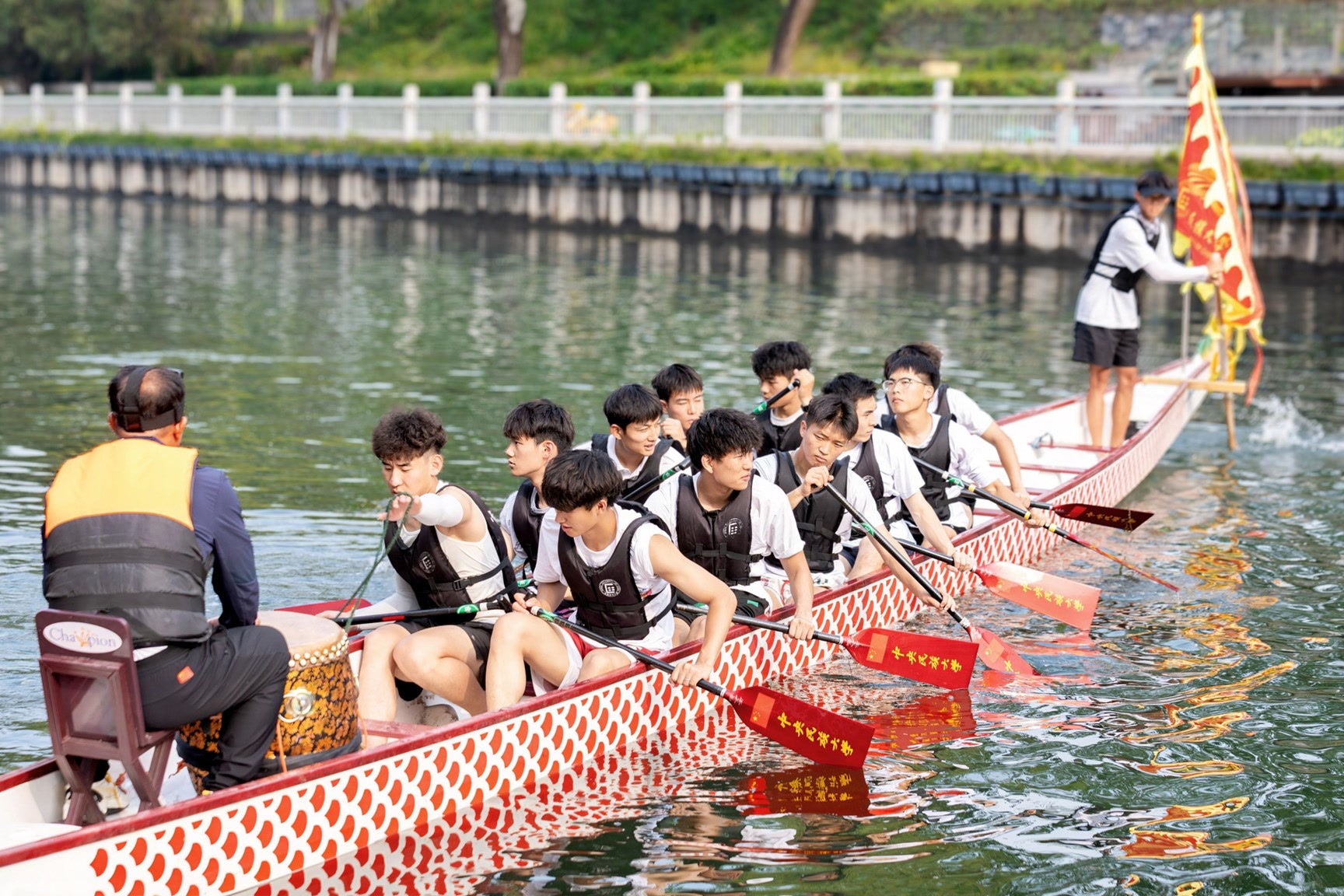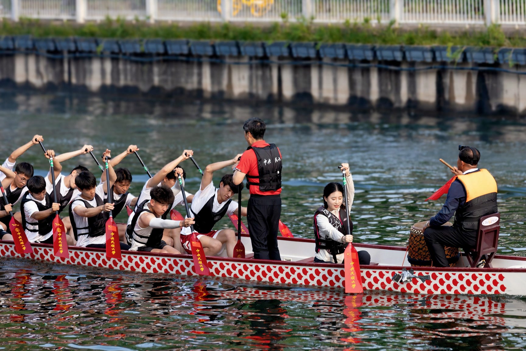 此次活动邀请了中央民族大学教授张凤民、教师王建强以及该校龙舟队参与。在课程中,老师详细阐述了北京中轴线的历史发展脉络和龙舟文化的深远意义,展示了龙舟点睛仪式,介绍了龙舟的结构及龙舟竞渡的技巧。随后,老师和队员们在护城河上进行了龙舟划行教学与表演,充分展现了龙舟运动的独特魅力。