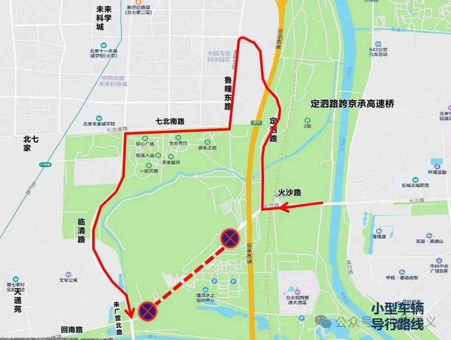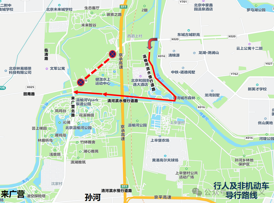 行人及非机动车可通过火沙路→温榆河滨水慢行道路→清河滨水慢行道路→来广营北路绕行。