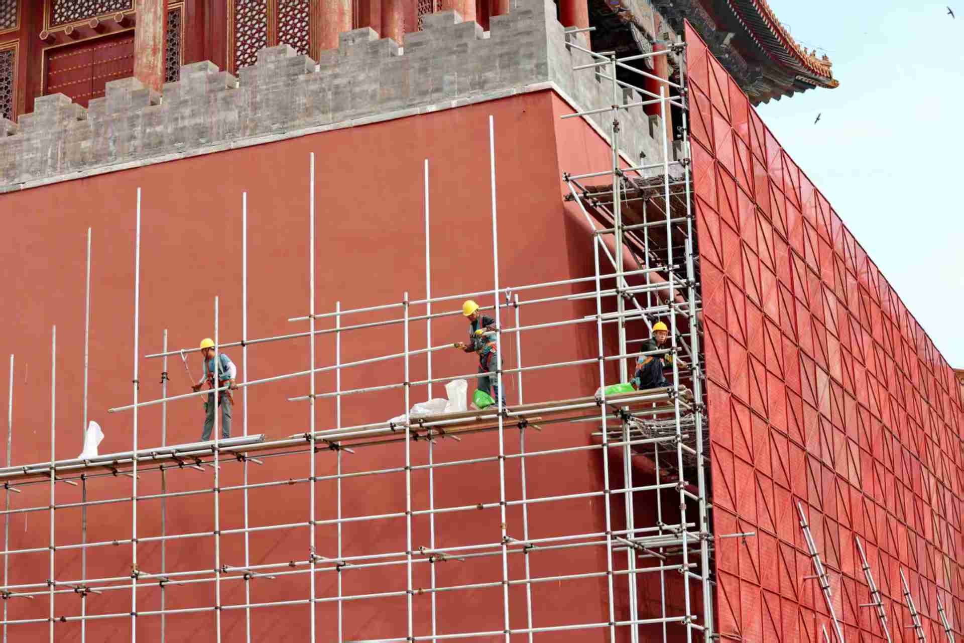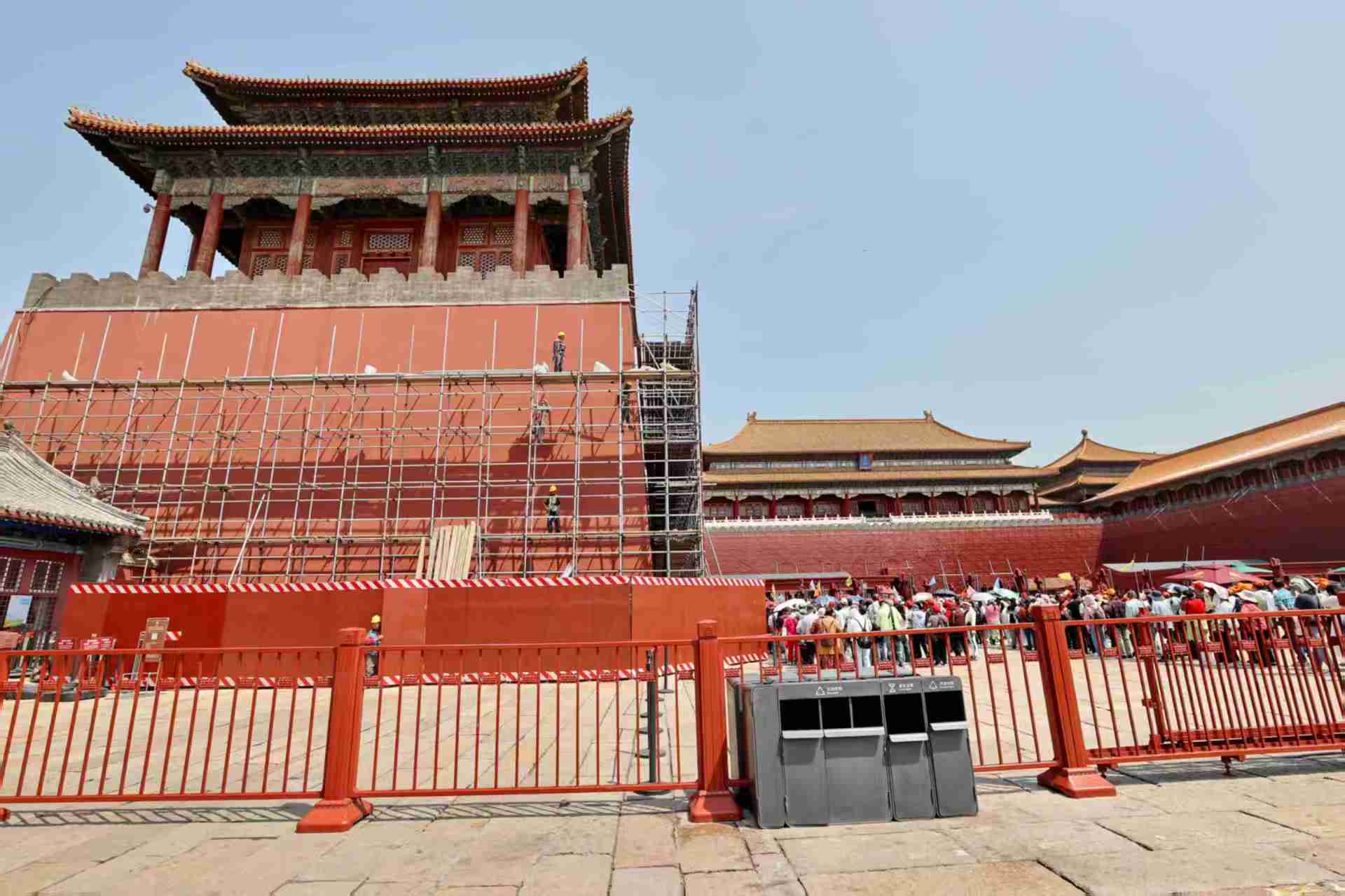 北京故宫午门燕翅楼搭建脚手架和防护栏对古建进行修缮。