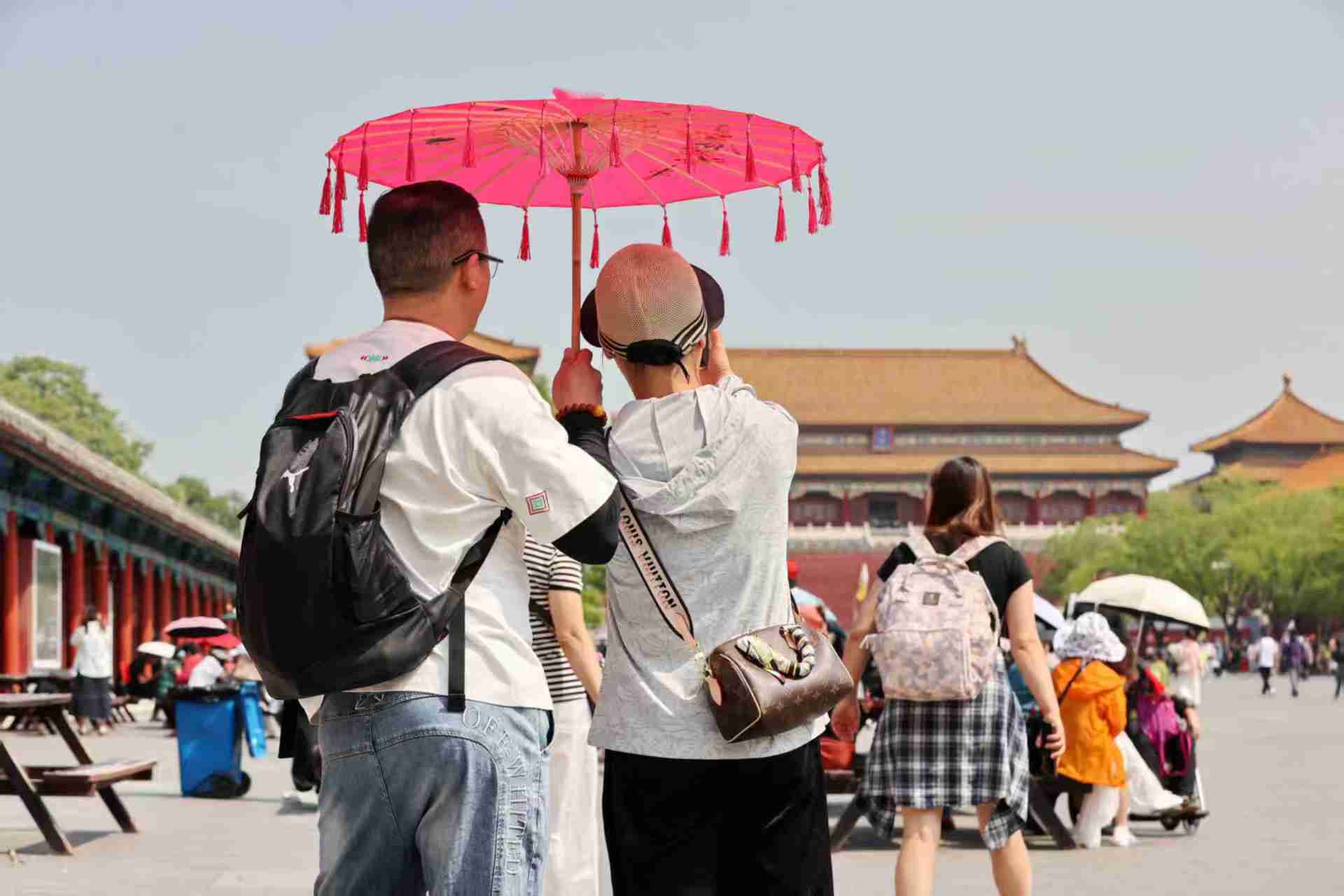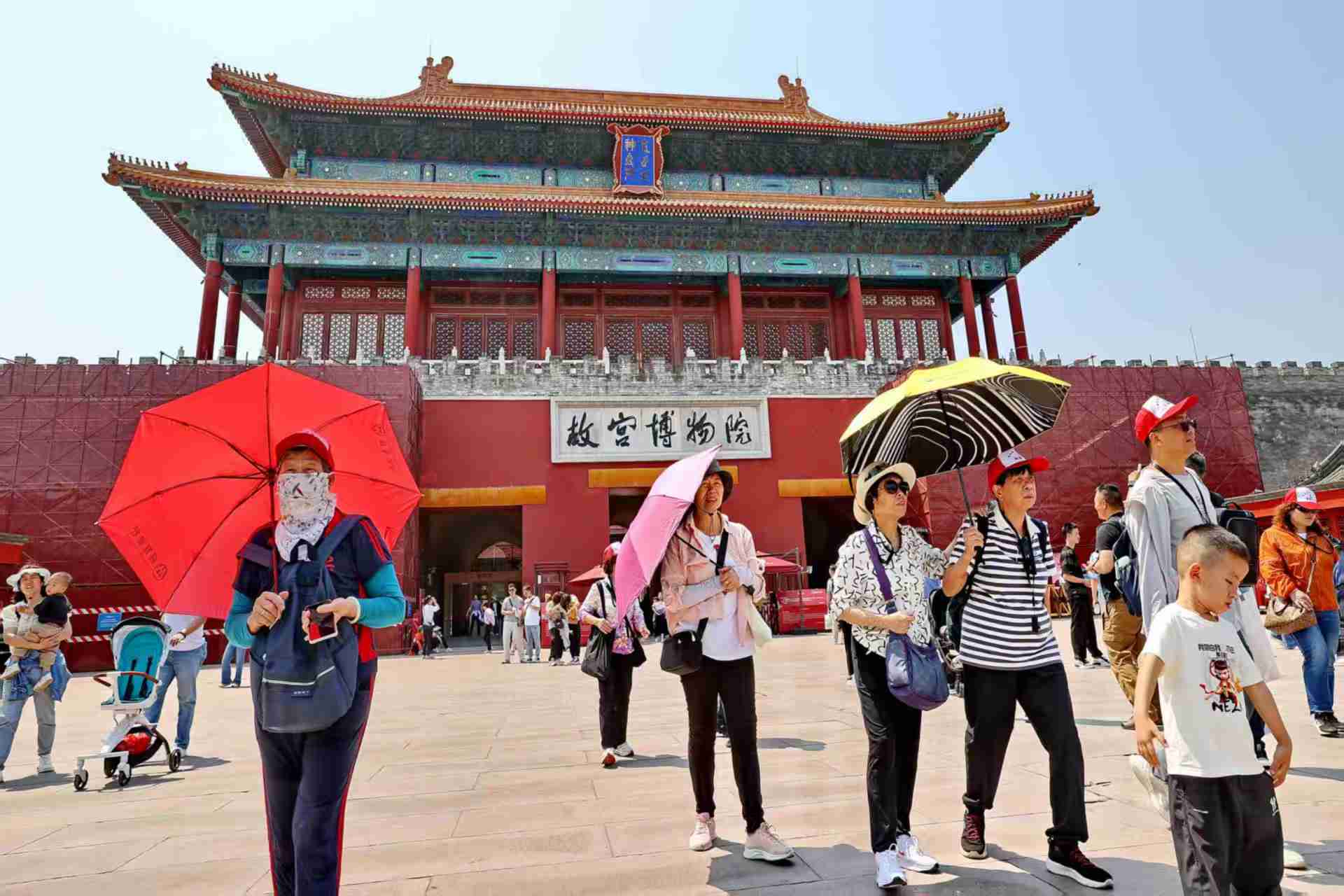 北京持续晴晒!游客撑伞逛故宫