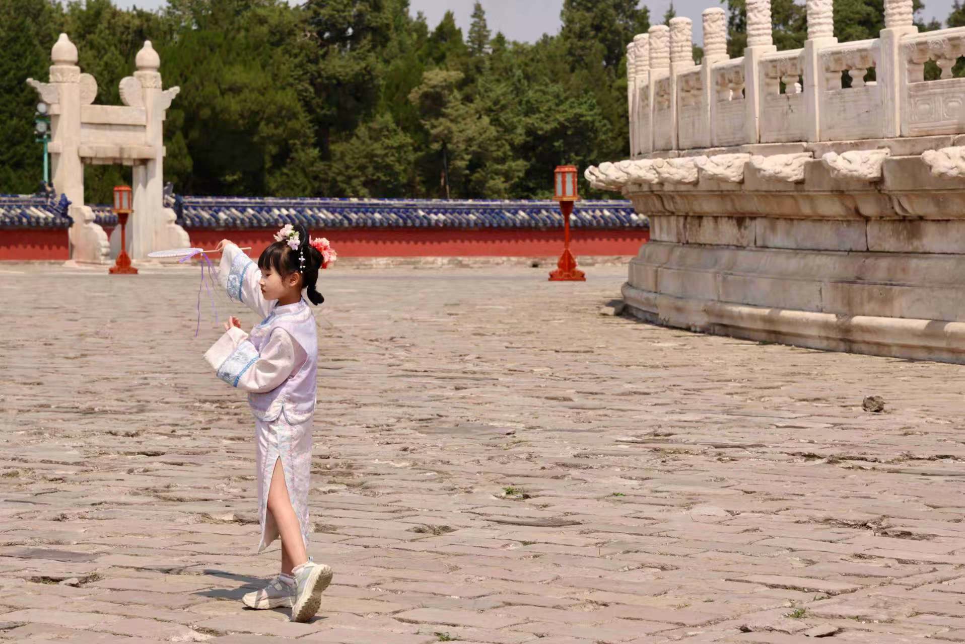 高温下,天坛公园里,蓝天白云,绿树成荫,国内外游客络绎不绝,兴致不减。