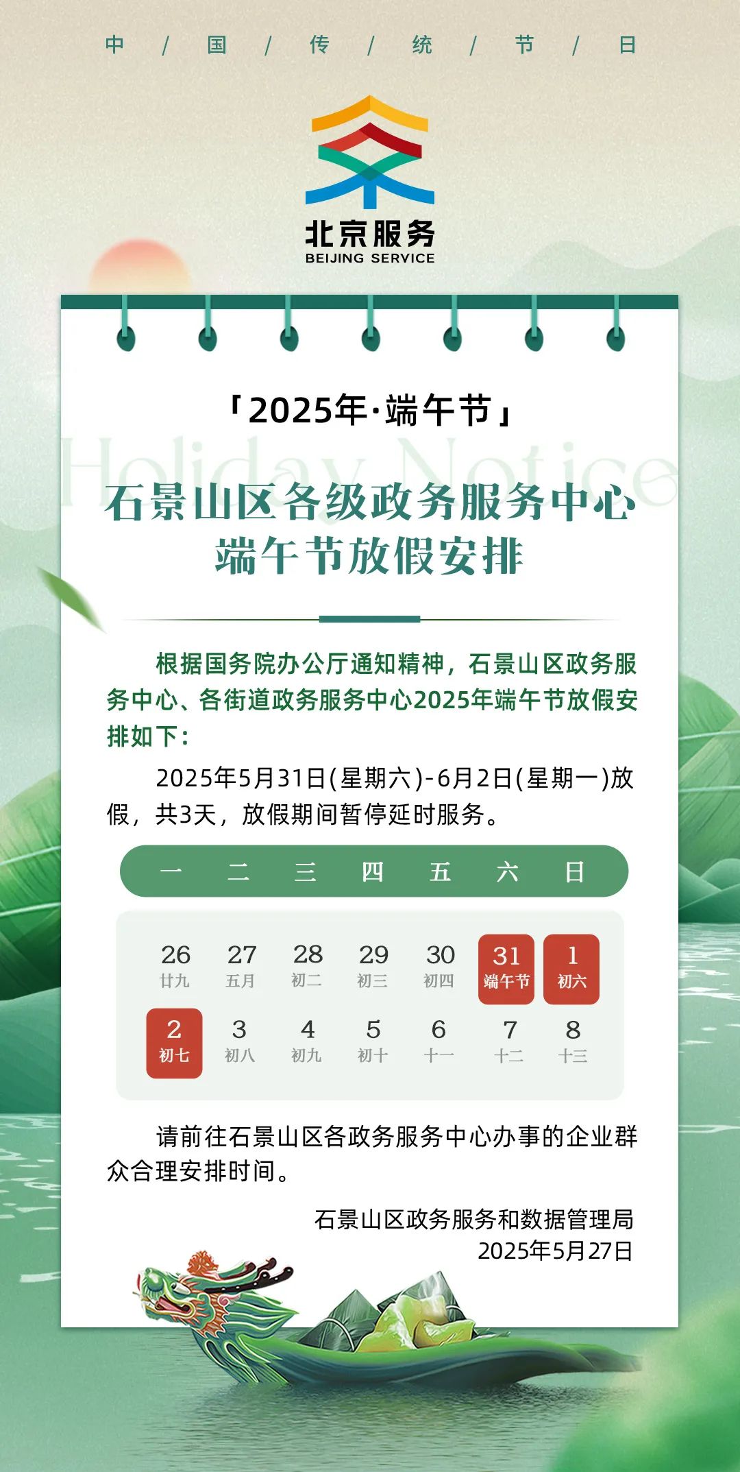 石景山区各级政务服务中心端午节放假通知来啦!