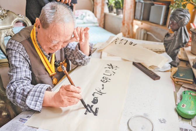 南国兴书写“我们的一九四五”。本报记者 邓伟摄