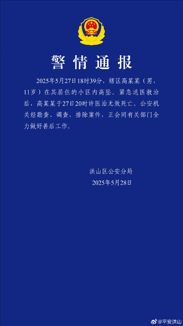 11岁男孩小区内坠亡,武汉警方通报