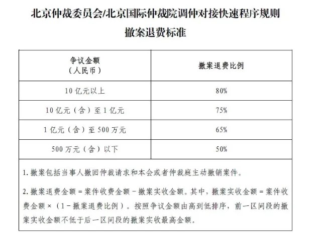 撤案退费将依据《北京仲裁委员会/北京国际仲裁院调仲对接快速程序规则撤案退费标准》执行。