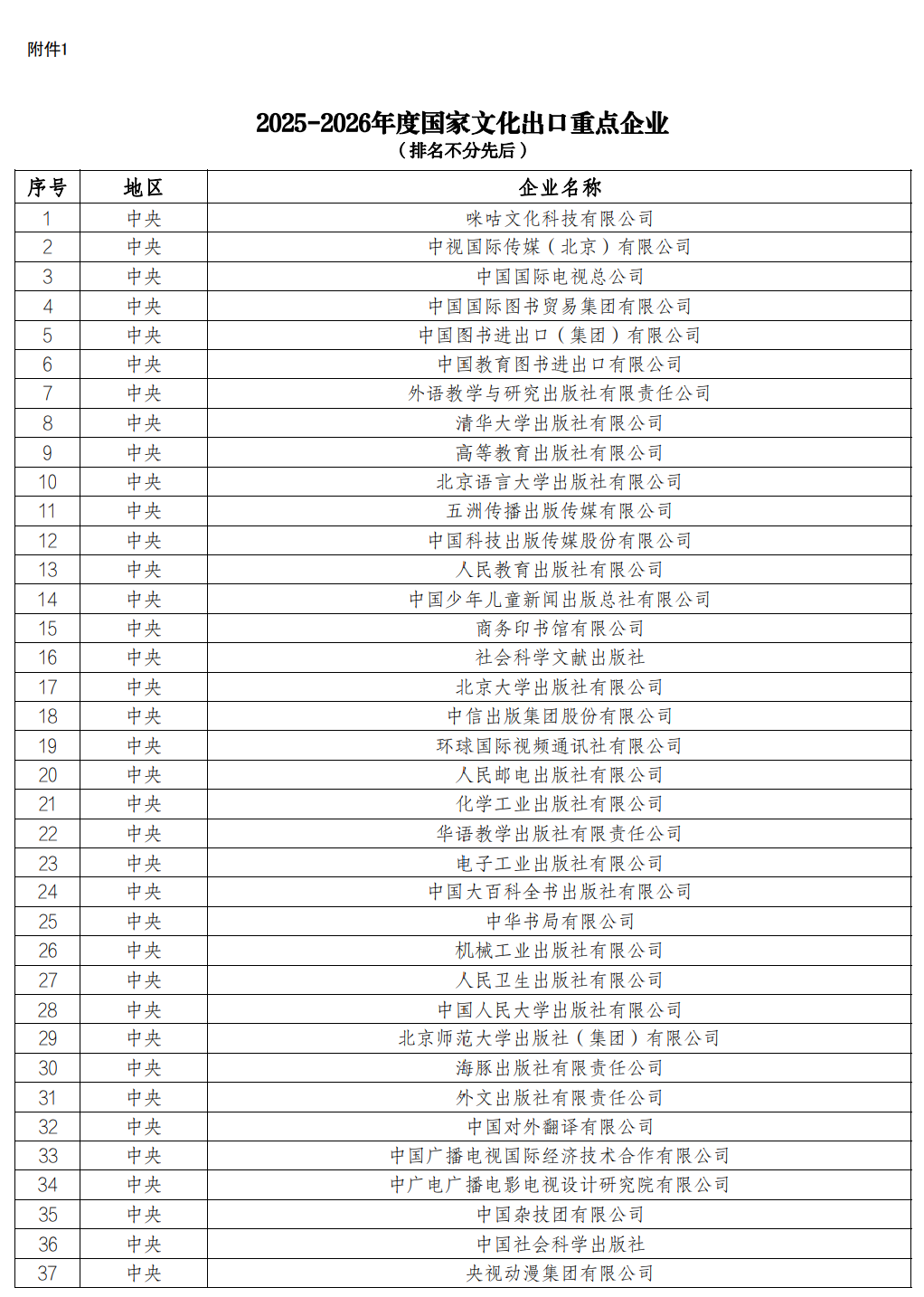 商务部等4部门联合发布2025-2026年度国家文化出口重点企业和重点项目公告