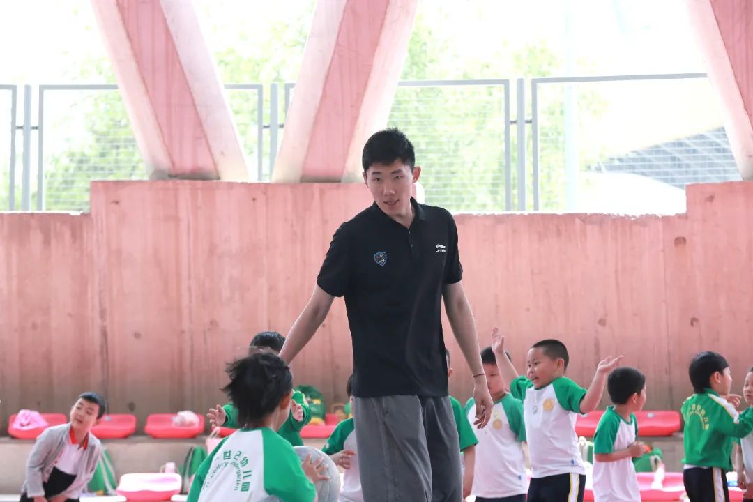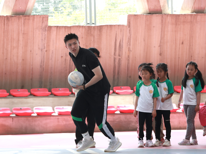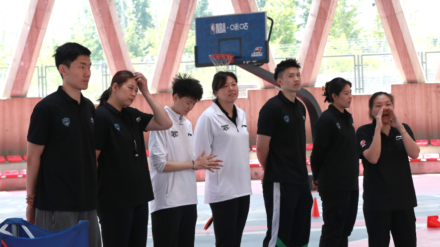 前CBA球员、现北京首钢篮球俱乐部训练营教练员张卓单膝跪地示范
